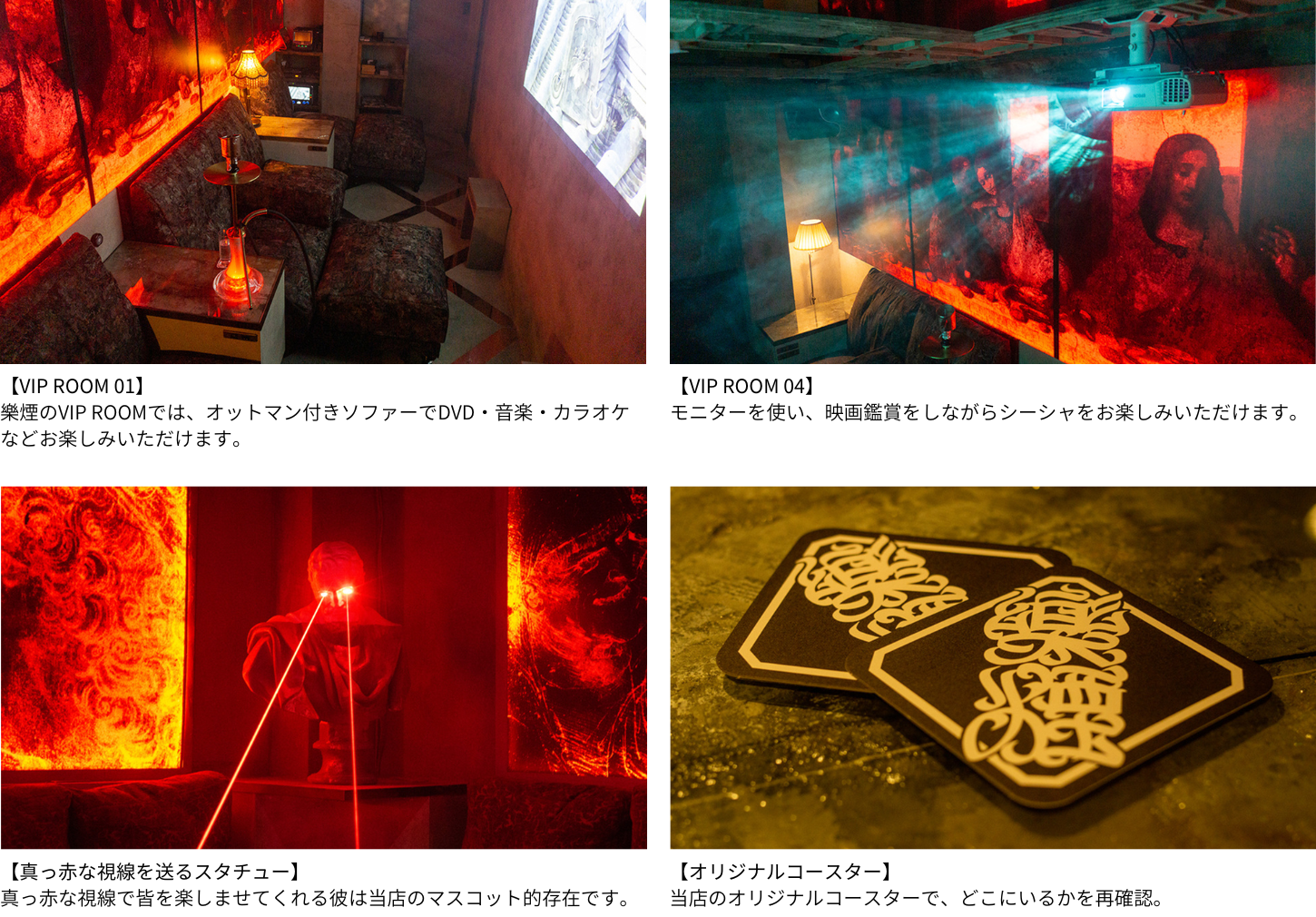様々なコンセプトと楽しみ方ができるVIPルームでは、シーシャと一緒に音楽や映画鑑賞、カラオケなど楽しむことができます。周辺には有名な飲食店も多くありますので、素敵なディナー後は是非、樂煙へ。