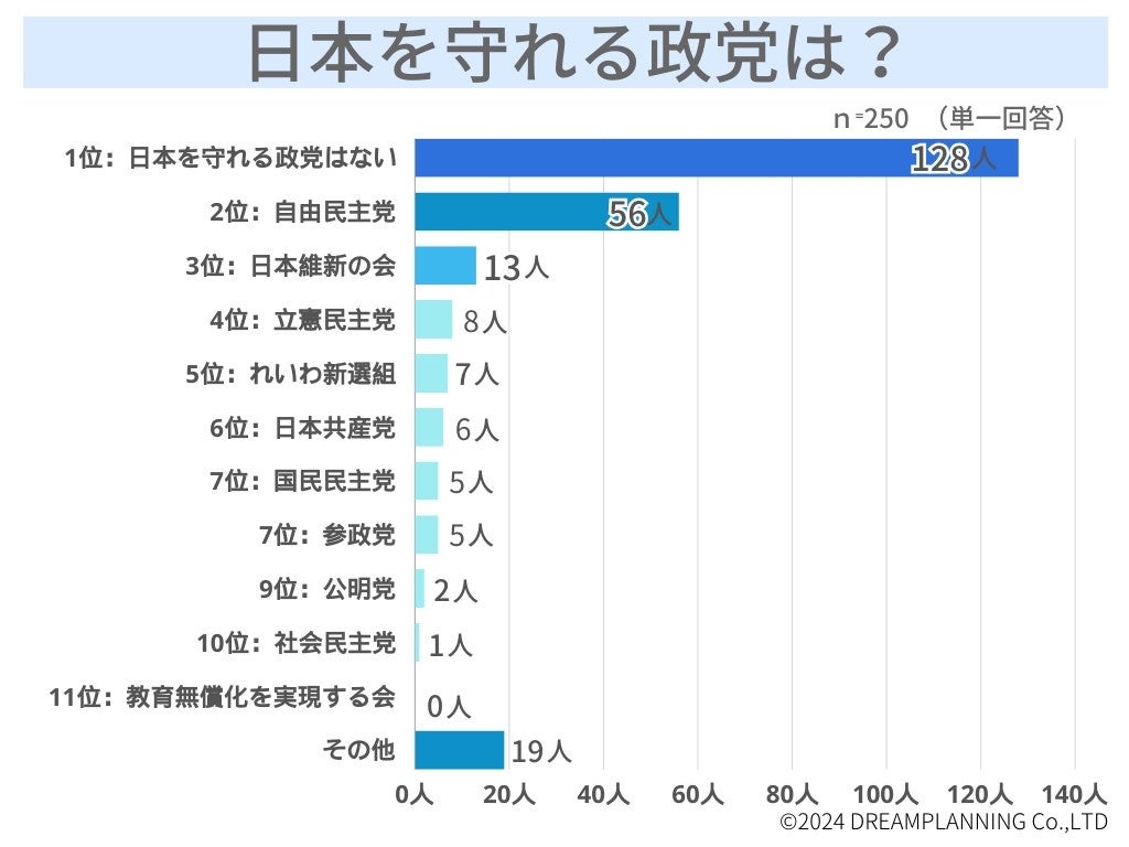「日本を守れる政党は」と聞かれたら、過半数の方が「そんなものはない」という回答でした。正直もっと多いと予想していましたが、支持政党への義理立てもあるのでしょう。