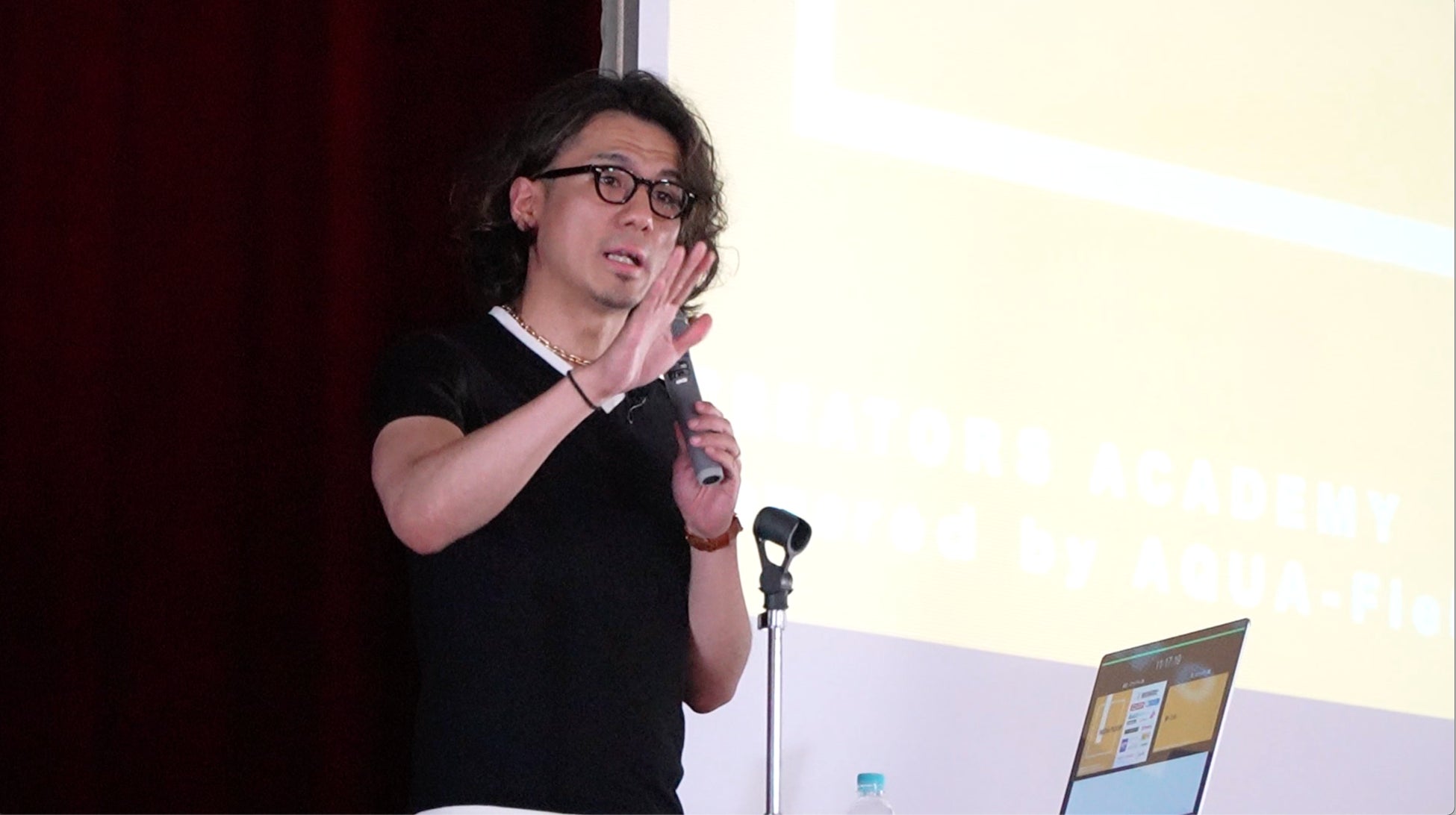 今回、大阪府立港南造形高等学校の在校生に向けて、社会で活躍する卒業生による講演会が行われた。当日の講演者は4名で、初めに株式会社アクアフィールド代表のハクノブアキ、次に同社でクリエイターズアカデミー講師を務める数井慎也が舞台に上がった。会場に集まった約600人の生徒たちが、時折笑いも起きるリラックスした空気の中でも真剣な態度で話に耳を傾け、自身の進学や就職など将来の進路を考える上での大切なヒントを受け取ろうとする姿がとても印象的であった。