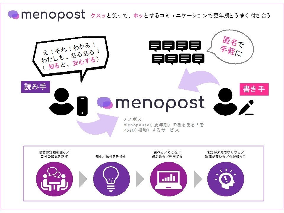 また、並行して、更年期女性の漠然とした不安を“クスっと笑ってホッとできるコミュニケーション”で解決するサービス「menopost(メノポス)」の事業化検討も推進中。過去に、経済産業省・JETRO(独立行政法人日本貿易振興機構)主催「始動 Next Innovator」や、愛知県主催「AICHI INNOVATION DAYS」などのピッチイベントで登壇実績を有します。