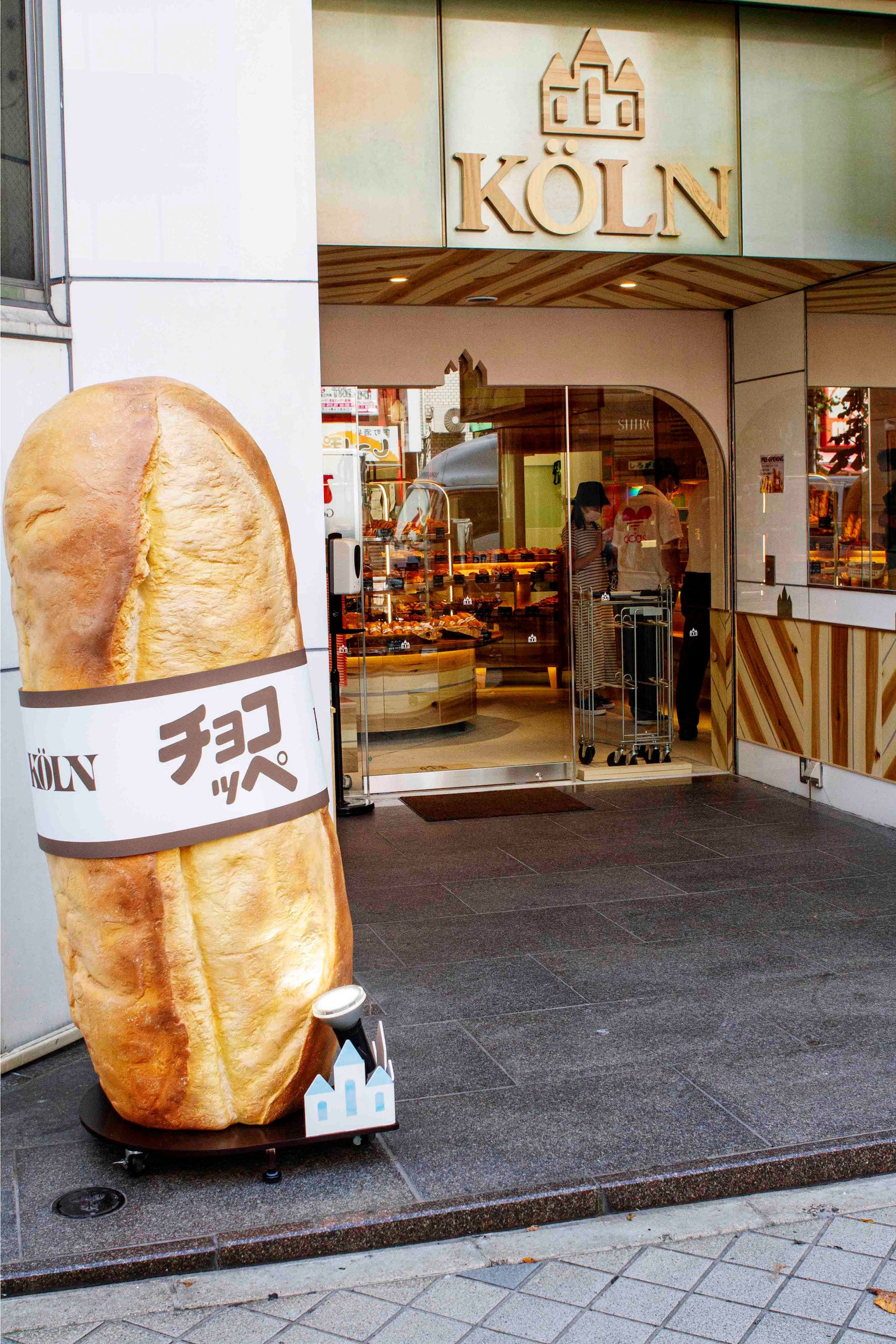 2023年にエリア内で移転した三宮店の店頭に置かれている高さ約160cmの巨大な看板も、やはりチョコッペ。チョコッペは、ケルンの“顔”として長年その役割を担ってきた、歴史の中でも特別なパンです。