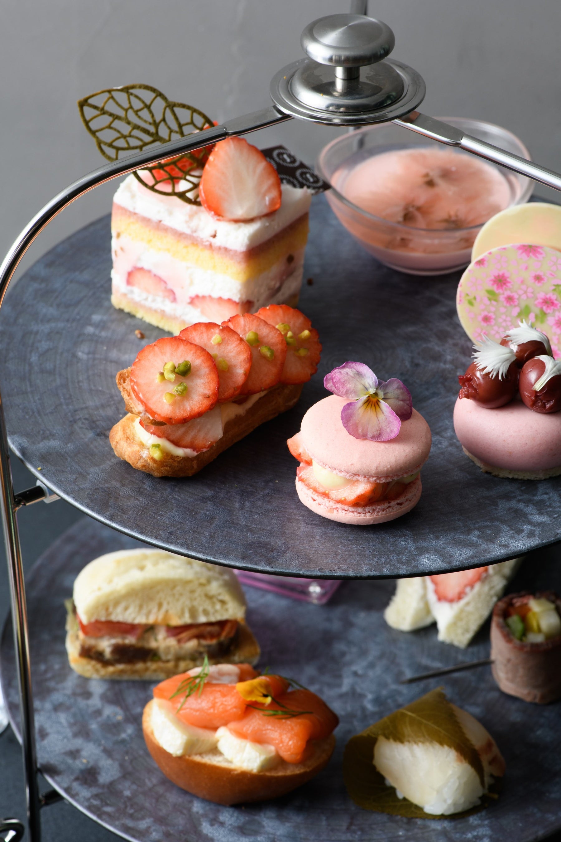 今季の『VIVARIUM Afternoon Tea』では、桜餡入りのクリームと苺のバランスが絶妙な「桜と苺のショートケーキ」や、トップに添えられた桜の花びらが可愛らしい「桜のパンナコッタ」など、春ならではの爽やかさや華やかな雰囲気がお楽しみいただけます。また、“桜”にちなんだ「県産桜鯛の手毬寿司」などのセイボリーや、焼き立てのスコーンにぴったりなチェリージャム、お花見の三色団子を連想させるような「花見三色だんごムース」など、この時期ならではのメニューをご用意しました。