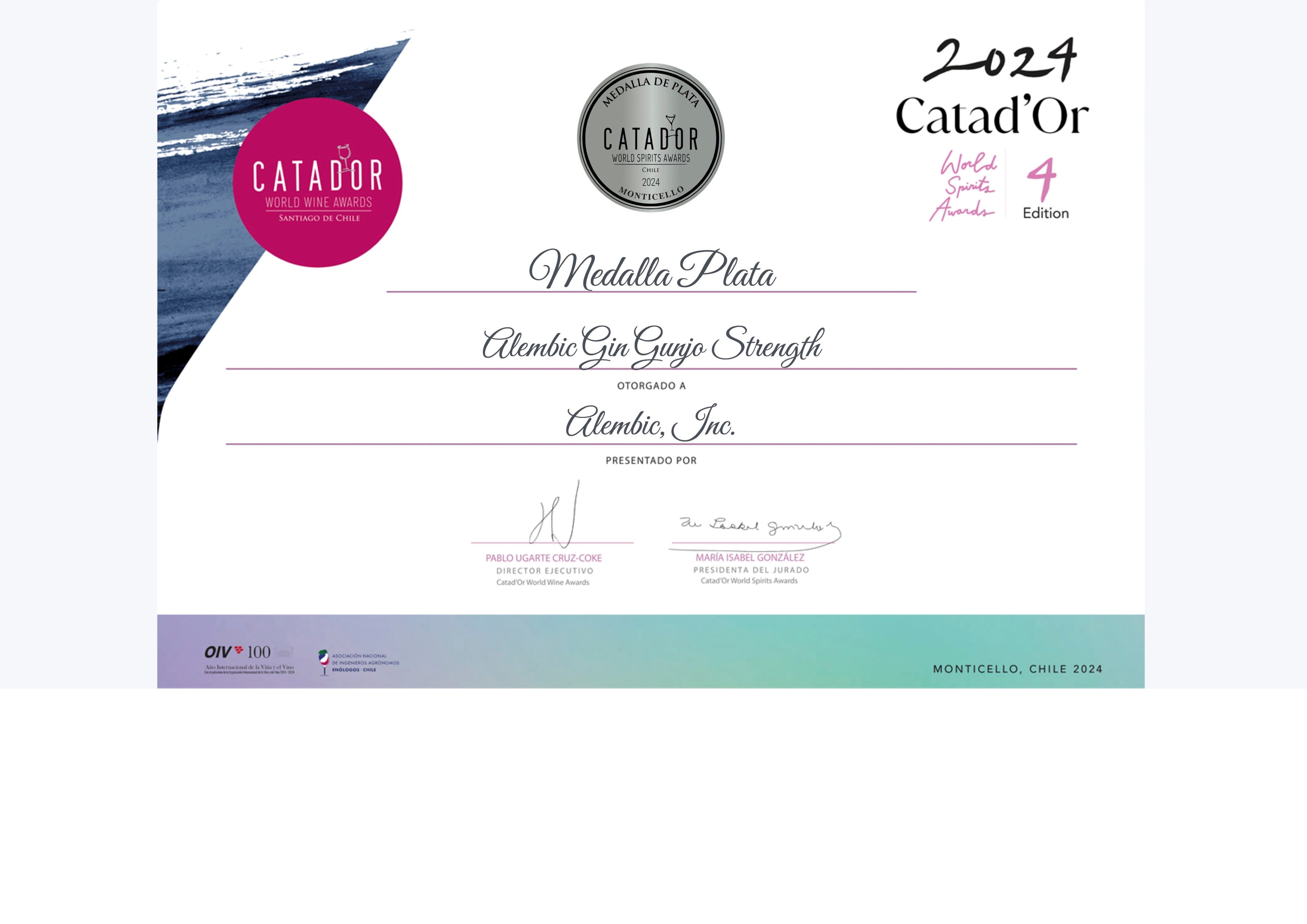 株式会社Alembic(所在地:石川県金沢市大野町、代表取締役:中川俊彦)は、2024年にチリ・サンティアゴ で開催された南米最大級の酒類品評会「カタドール・ワールド・スピリッツアワード(Catad’Or World Spirits Awards)」において、当社の商品「アレンビックジン・群青ストレングス」が銀賞を受賞しました。