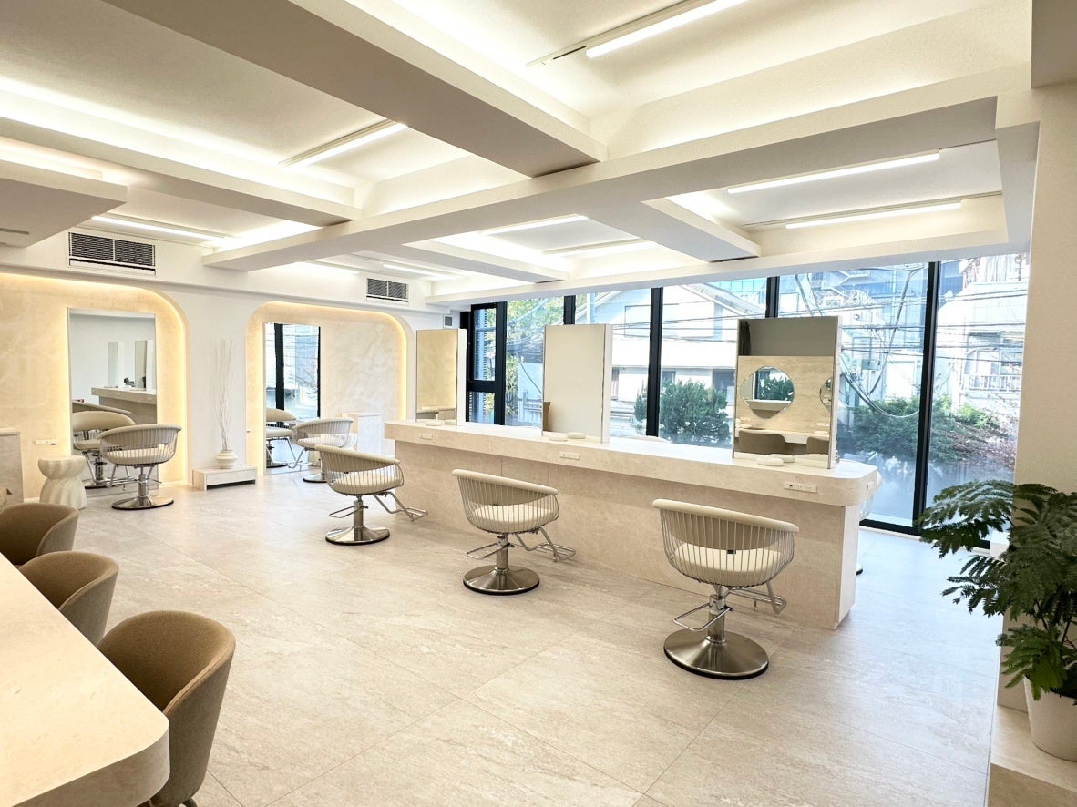 リニューアル後のメインフロアは、白とナチュラルストーンを基調とした柔らかなトーンで構成。大きな窓から自然光が差し込む開放感ある空間に、ゆったりと配置されたセット面9席とメイク直しなどゆっくりと出来るコールドスペース3席が並びます。