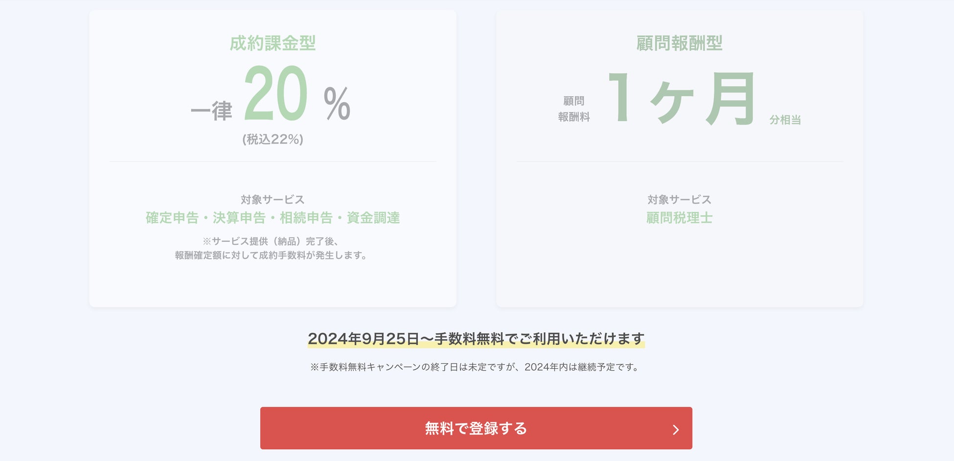 これまで、確定申告、決算申告、相続申告、資金調達、補助金・助成金申請などのサービスにおいて、税理士は報酬の20%(税抜)を手数料として支払っておりました。また、顧問報酬型サービスでは、一ヶ月分の報酬相当額が手数料となっておりましたが、本日から全て無料でご利用いただけます。