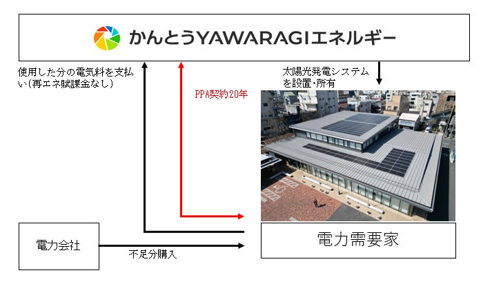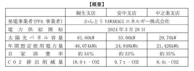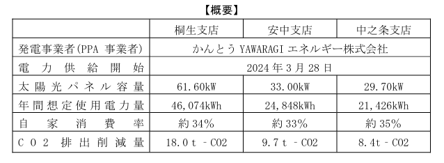 かんとうYAWARAGIエネルギー株式会社(代表取締役 三村挑嗣、以下「当社」)は、群馬銀行(頭取 深井彰彦、以下「同行」)と2023年10月にオンサイトPPA* モデルによる契約を締結し、同行桐生支店、安中支店および中之条支店の3店舗において、各店舗屋上に太陽光発電設備の設置を進めてまいりましたが、この度設置が完了し、再生可能エネルギー電力の発電を開始しましたので、下記のとおりお知らせいたします。