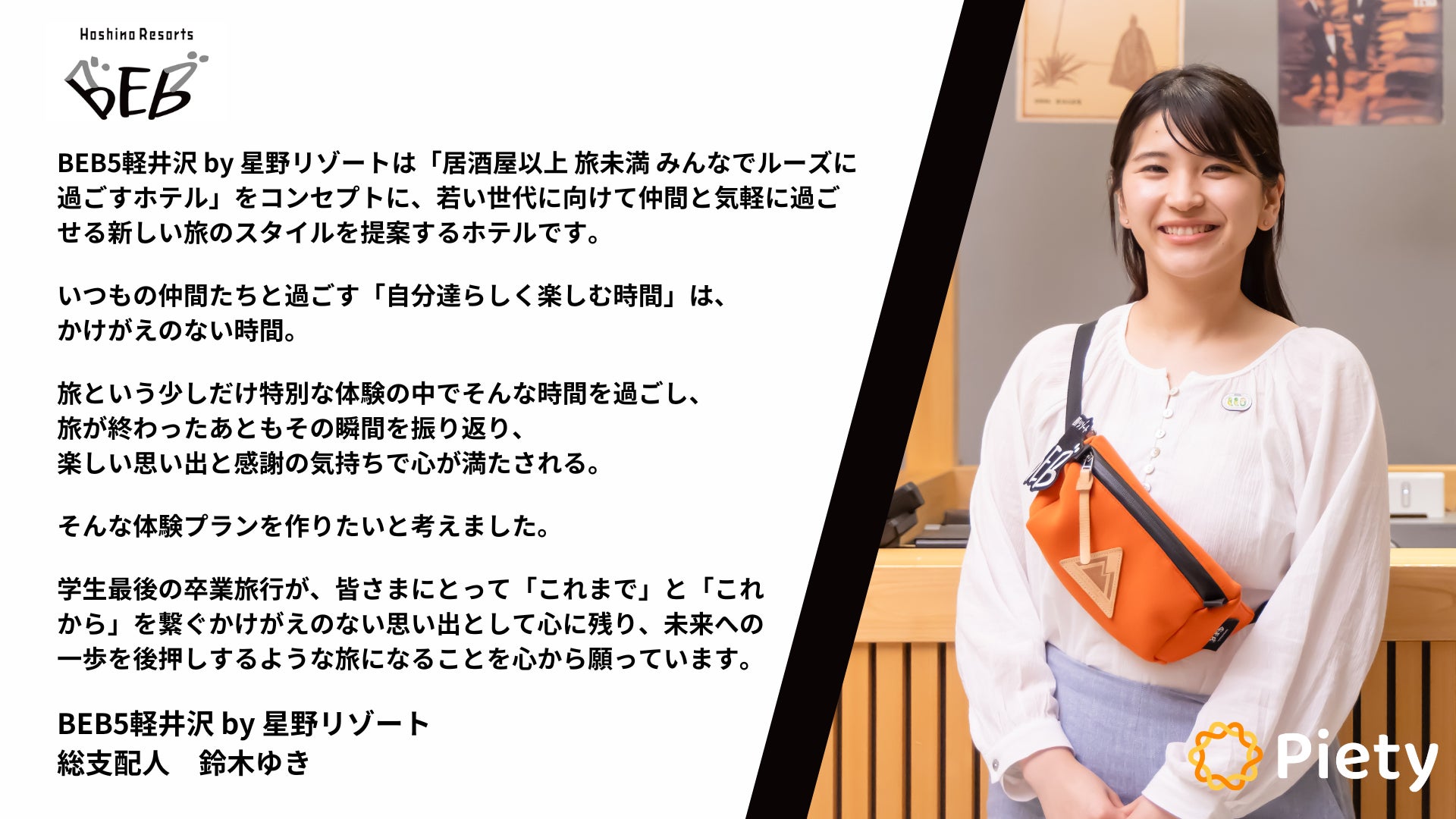 新たな出会いに心躍る一方で、大切な人との別れに涙がこぼれる卒業シーズン。「大切な人との別れを悲しい気持ちのまま終わらせるのではなく、これまでの感謝の気持ちを伝えることで、さらに絆を深める機会にしたい」というPietyの想いに、若い世代に新たな旅のスタイルを提案するBEB5軽井沢 by 星野リゾートが共感し、本プランの企画に至りました。