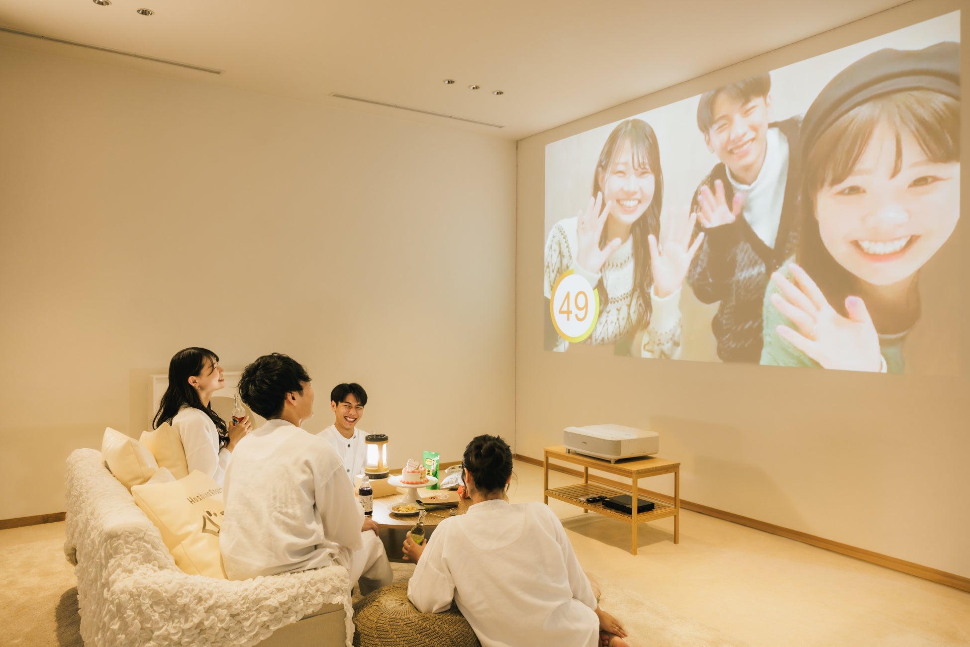 日中に撮影したビデオレターは、Pietyにより即日編集されます。ビデオレターは、客室とは別に用意された卒旅プラン専用のお部屋で、プロジェクターに投影し楽しめます。大画面でみんなで一緒に鑑賞するビデオレターは、特別な思い出になること間違いなし!さらに、素敵な時間を盛り上げるオプションとして、ケーキやミニブーケを用意しています。サプライズやお祝いの演出に利用をするのもおすすめです。