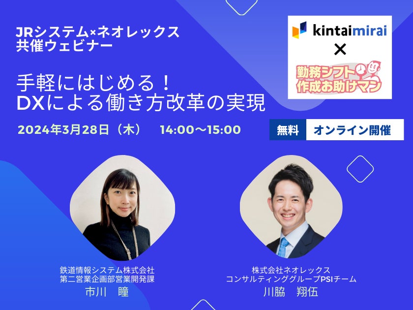シフト管理サービス「勤務シフト作成お助けマン」を運営する「JRシステム」と勤怠管理サービス「キンタイミライ」を運営する「ネオレックス」の共催ウェビナーを開催します。