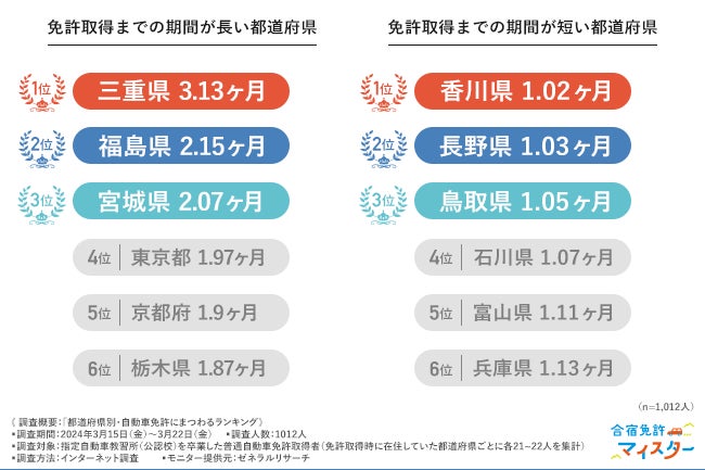 免許取得にかかる期間も地域差が顕著で、最短の香川県では平均1.02ヶ月、最長の三重県では平均3.13ヶ月となっています。