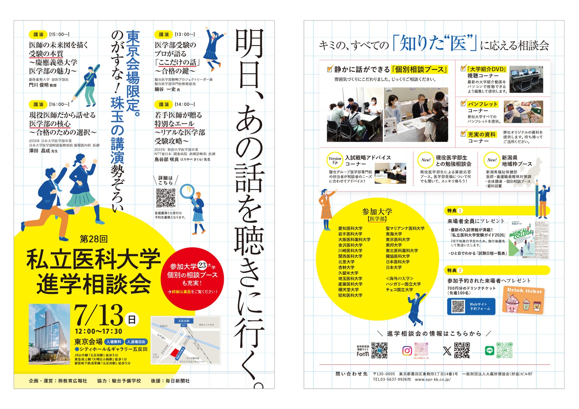 (株)教育広報社は、"医師を志すすべての人"を対象に「第28回 私立医科大学進学相談会 2025」を7月13日の東京会場(@シティホール&ギャラリー五反田)を皮切りに、全国6会場で開催いたします。