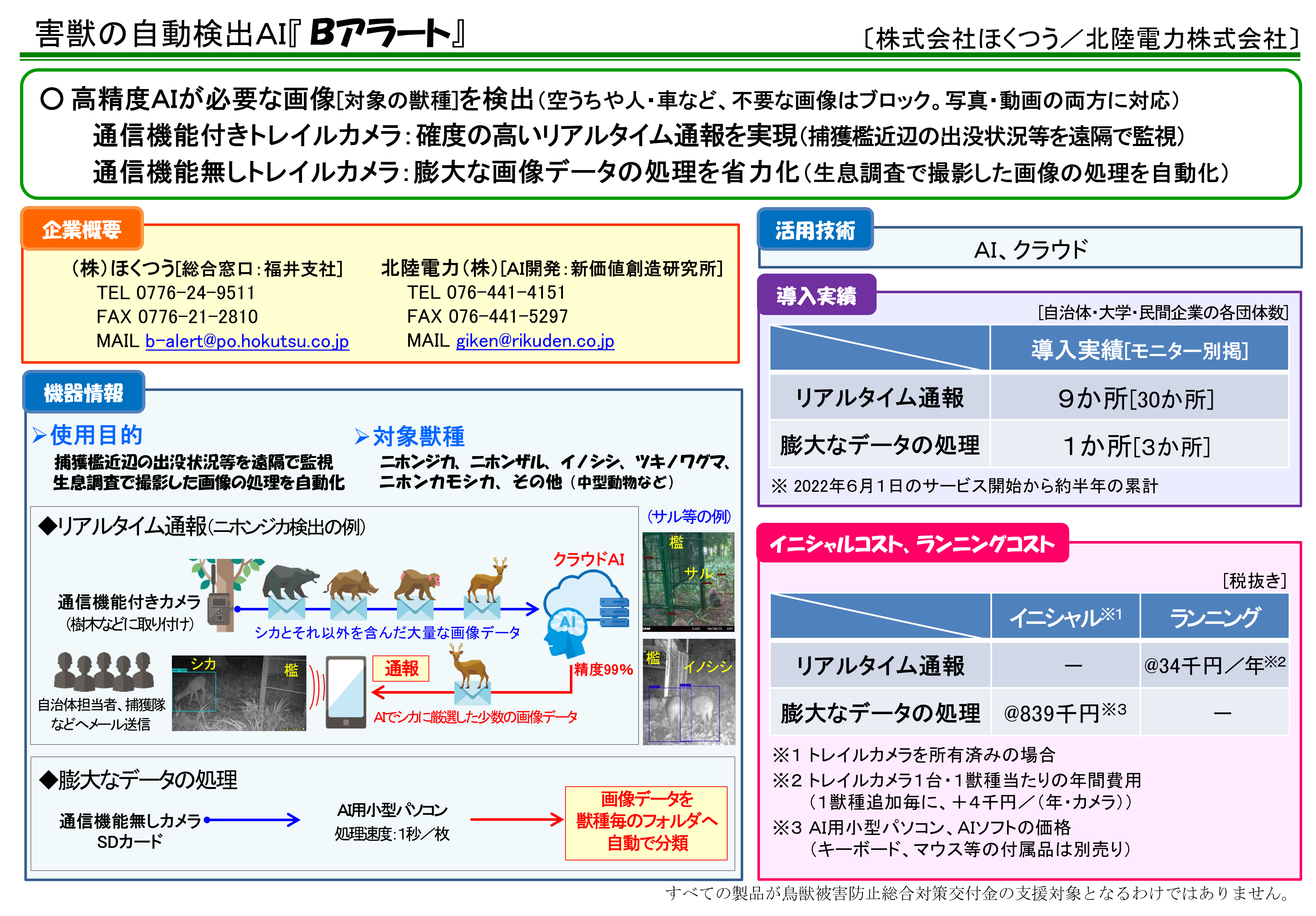 この取り組みの一環として、クマが写っている画像だけを検出するAIを開発し、令和3年度に富山県での実証実験を経て、害獣の自動検出AI(製品名『Bアラート』)を商品化し全国へサービスを提供しています。