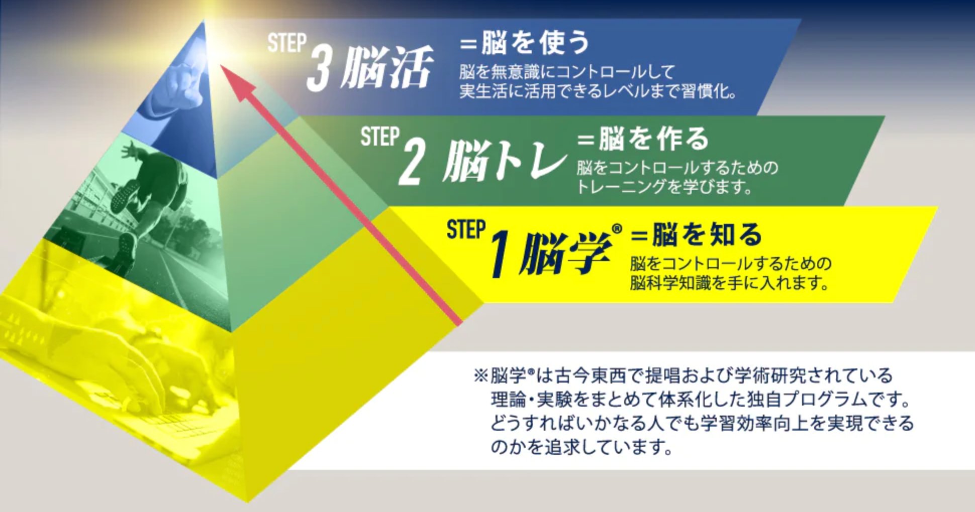 脳学®は古今東西で提唱及び学術研究されている理論・実験をまとめて体系化した弊社独自のプログラムで、どうすればいかなる人でも学習効率向上を実現できるのかを追求しています。