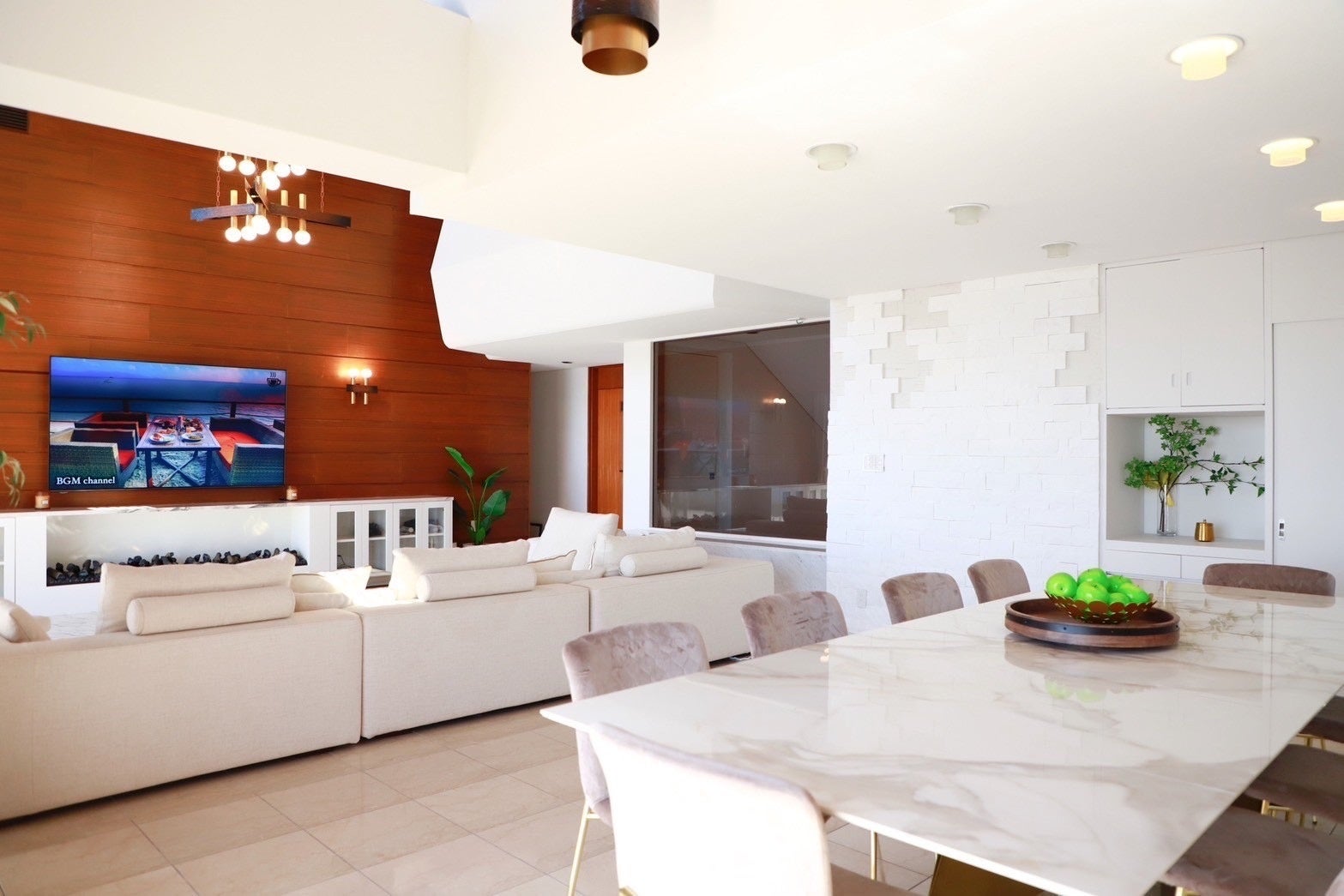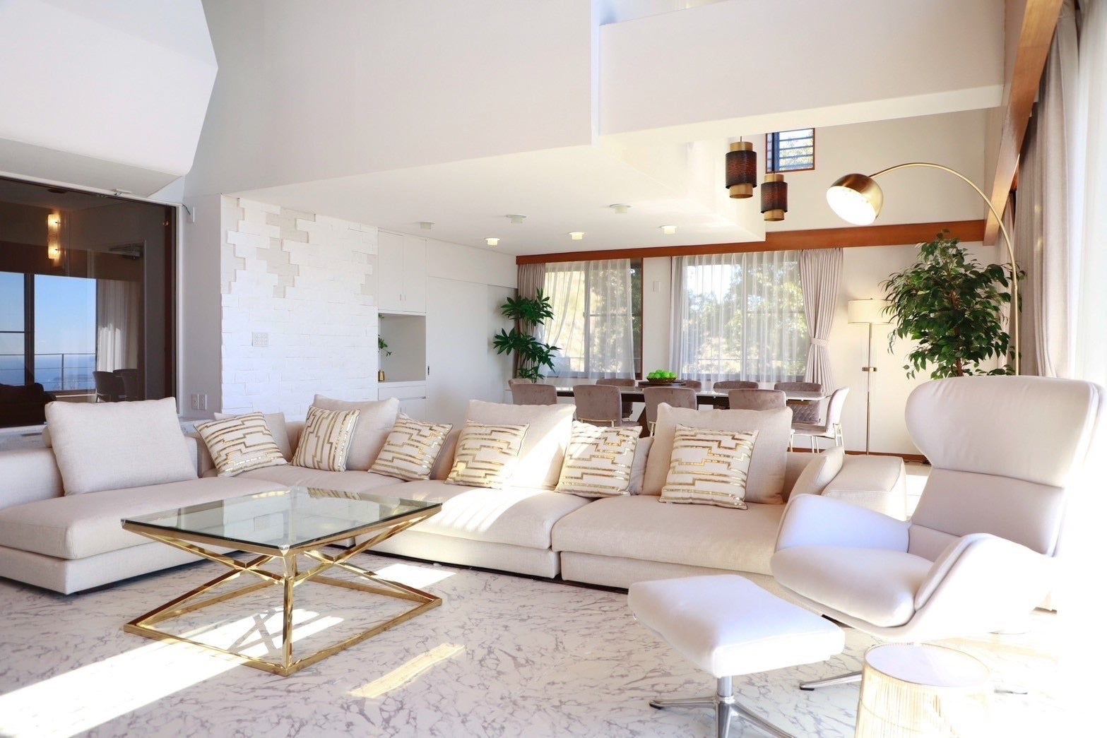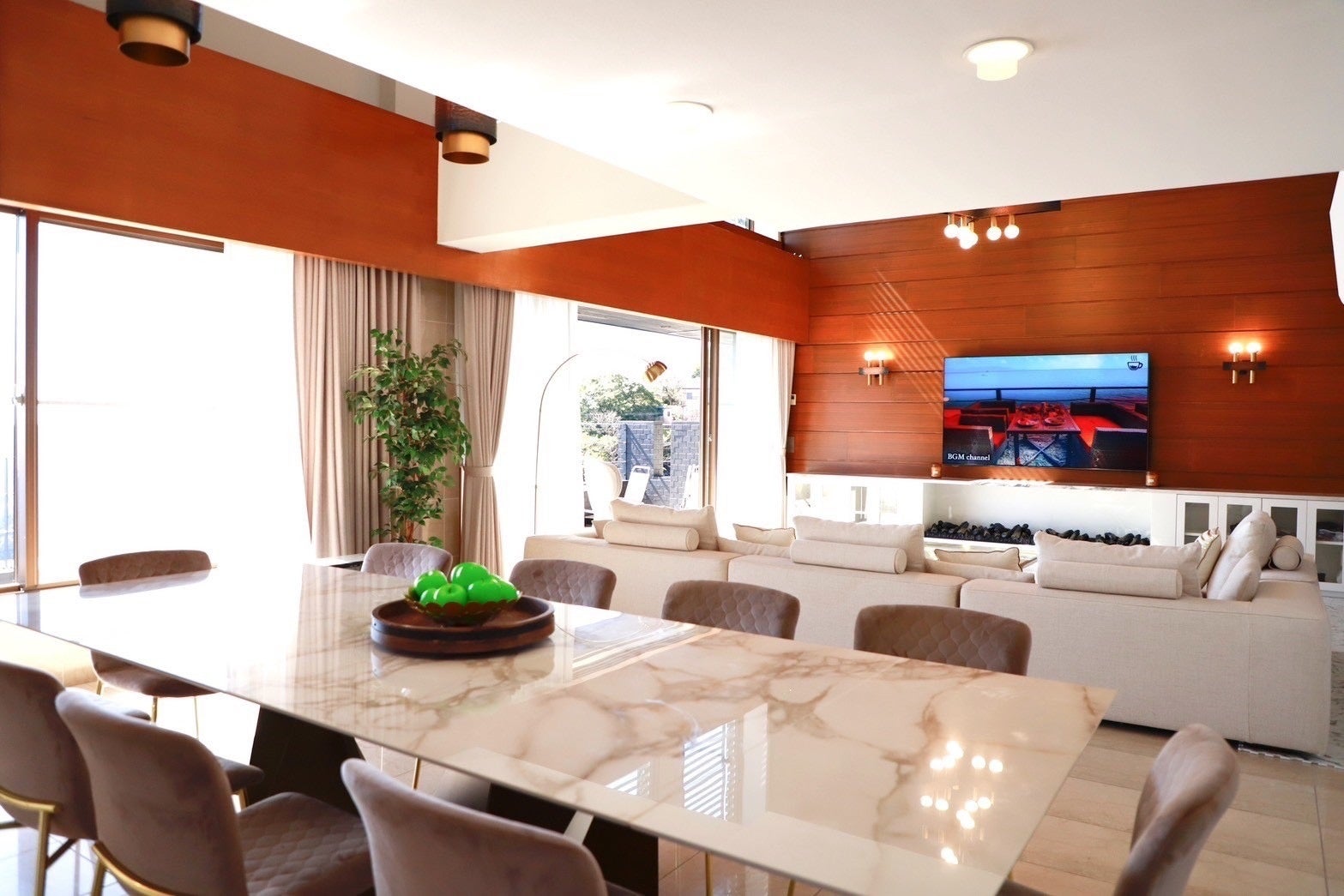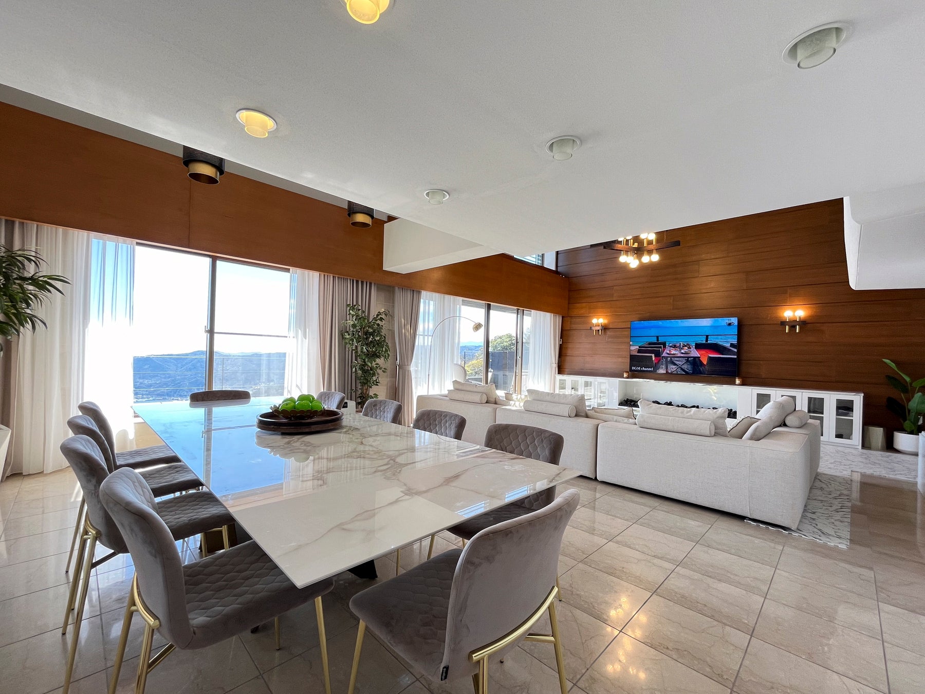 大きな窓から海を望む開放感あふれるリビングダイニングでは、時間の流れを忘れ、ゆったりとお過ごしいただけます。都会の喧騒から離れた完全プライベートな空間で、心も体も深く解きほぐす、贅沢な滞在をお楽しみください。