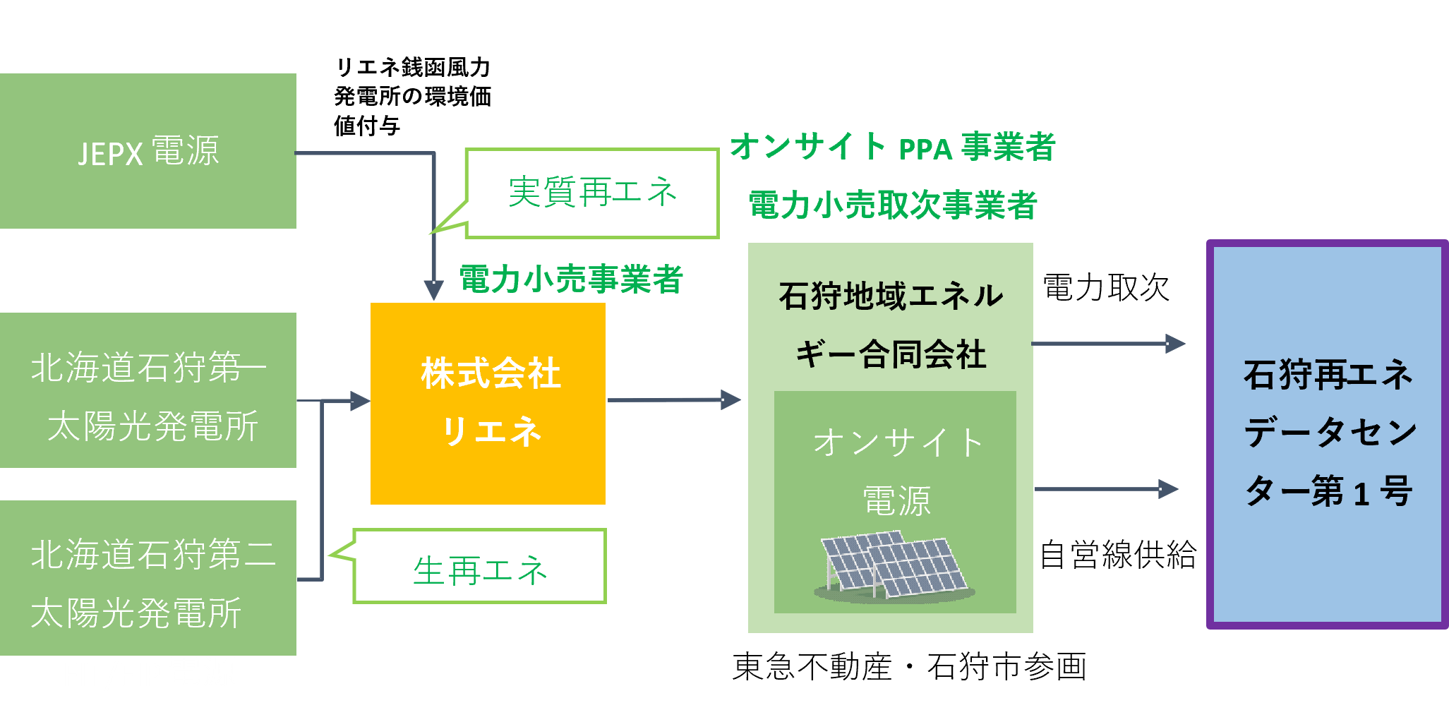 石狩再エネデータセンター第1号は、石狩湾新港地域の再生可能エネルギーを100%活用するグリーンデータセンター事業を実現する目的で、東急不動産株式会社(本社所在地:東京都渋谷区、代表取締役社長:星野 浩明)及び北海道石狩市(所在地:北海道石狩市、市長:加藤 龍幸)が事業参画している石狩地域エネルギー合同会社とPPA基本契約書を締結いたしました。石狩地域エネルギー合同会社が保有する北海道石狩第一太陽光発電所及び北海道石狩第二太陽光発電所からオンサイトPPA(Onsite Power Purchase Agreement)で長期間、安定的に再生可能エネルギーを調達いたします。