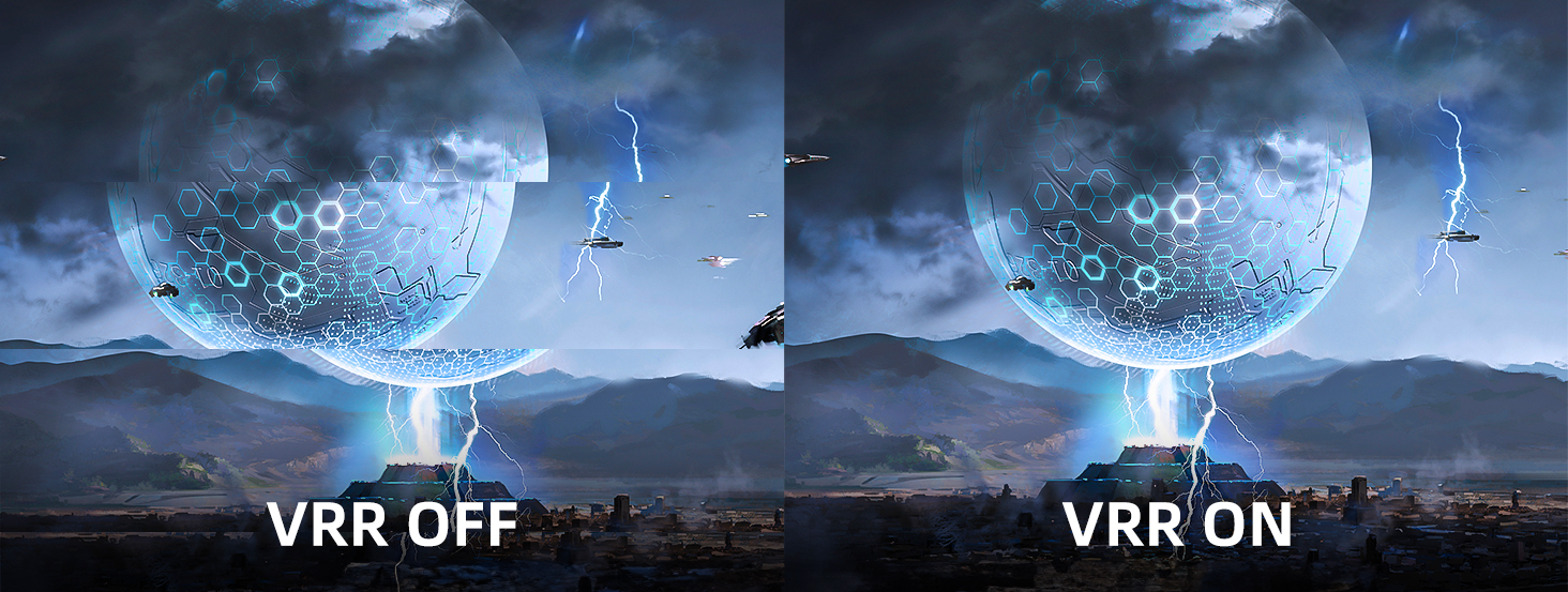 VRR(Variable Refresh Rate)に対応。ゲーム機とモニター間の同期ズレが原因で発生する画像のティアリング(同期ズレが原因で発生する横線表示)を解消し、スムーズな映像が得られます。