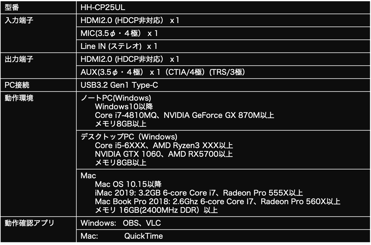 HDMI入力は最大4K@60fps、USB出力は最大1080P@60fpsに対応
