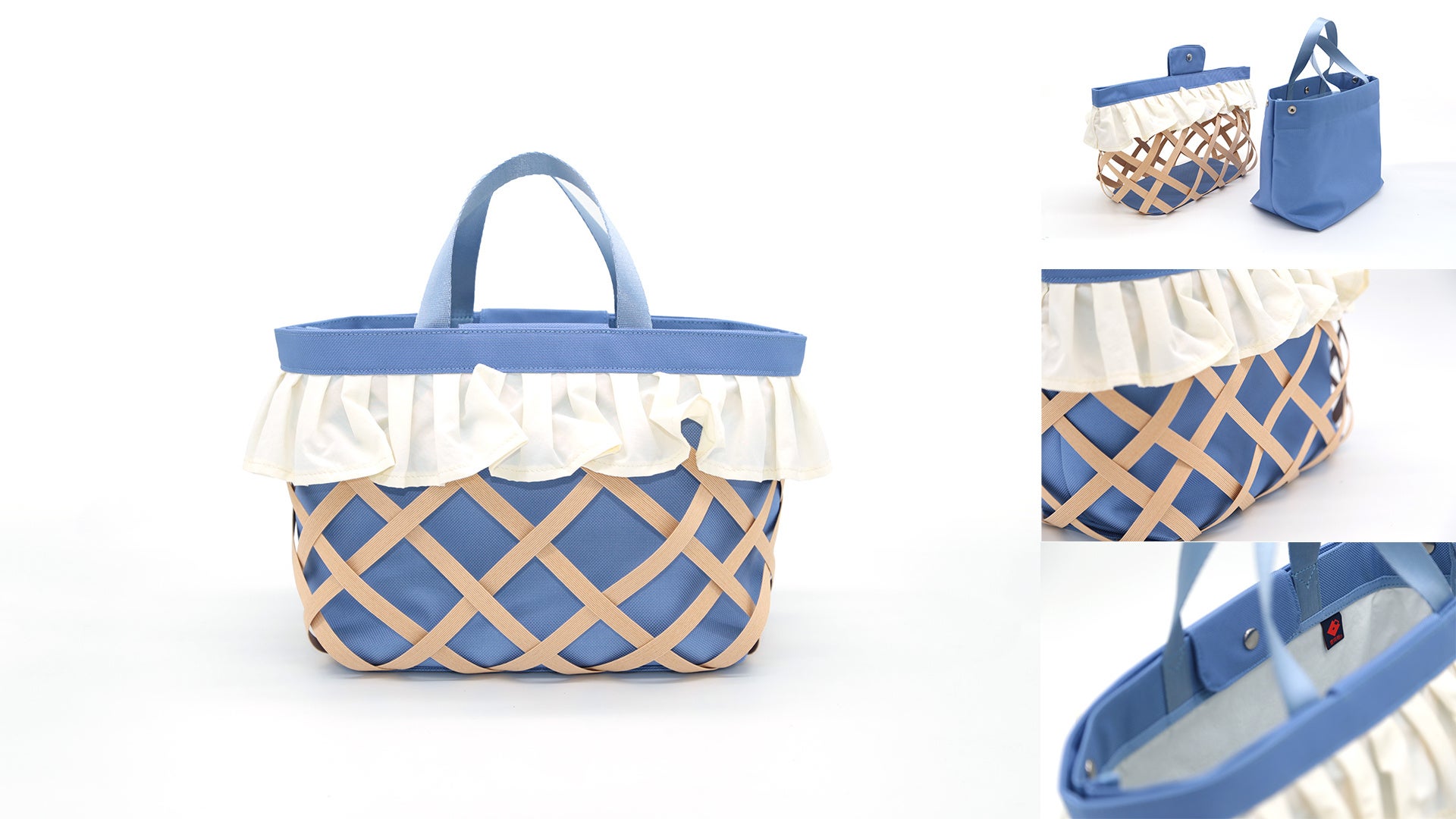 外側のかごはエコクラフト、トートは漁網再生ナイロンを使った、サステナブルなトートバッグです。みゆうさんとの打ち合わせを経て、リバーシブルから2way仕様に変更。かごとトートを分離させても使えるように作っています。かごの編み目が粗いので、形を維持したまま縫い上げるのがとても大変でした。クラフトテープの強度を保てるよう、斜めに縫い目を入れるなど、表には見えないこだわりが詰まっています。