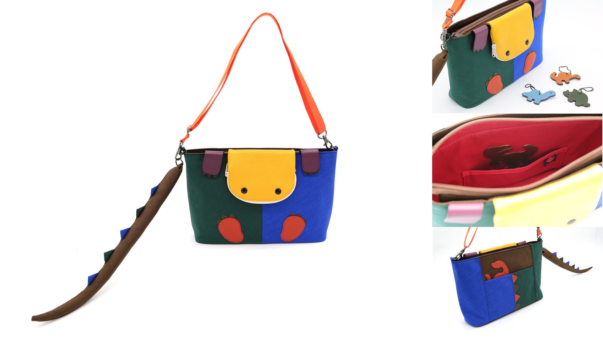「製作前の打ち合わせで、かばん全体を恐竜にすることになりました。顔や腕、尻尾など、鞄のあちこちに恐竜の要素をしのばせています。顔はポケットにもなっていて、チャックを開けたときに口に見えるよう、内装を赤にしています。描いてくれていた恐竜の絵をもとに、キーホルダーも作りました。難しい挑戦もありましたが、アイデアマンであるしゅんさんの喜ぶ顔を想像しながら、頑張って作りました。」