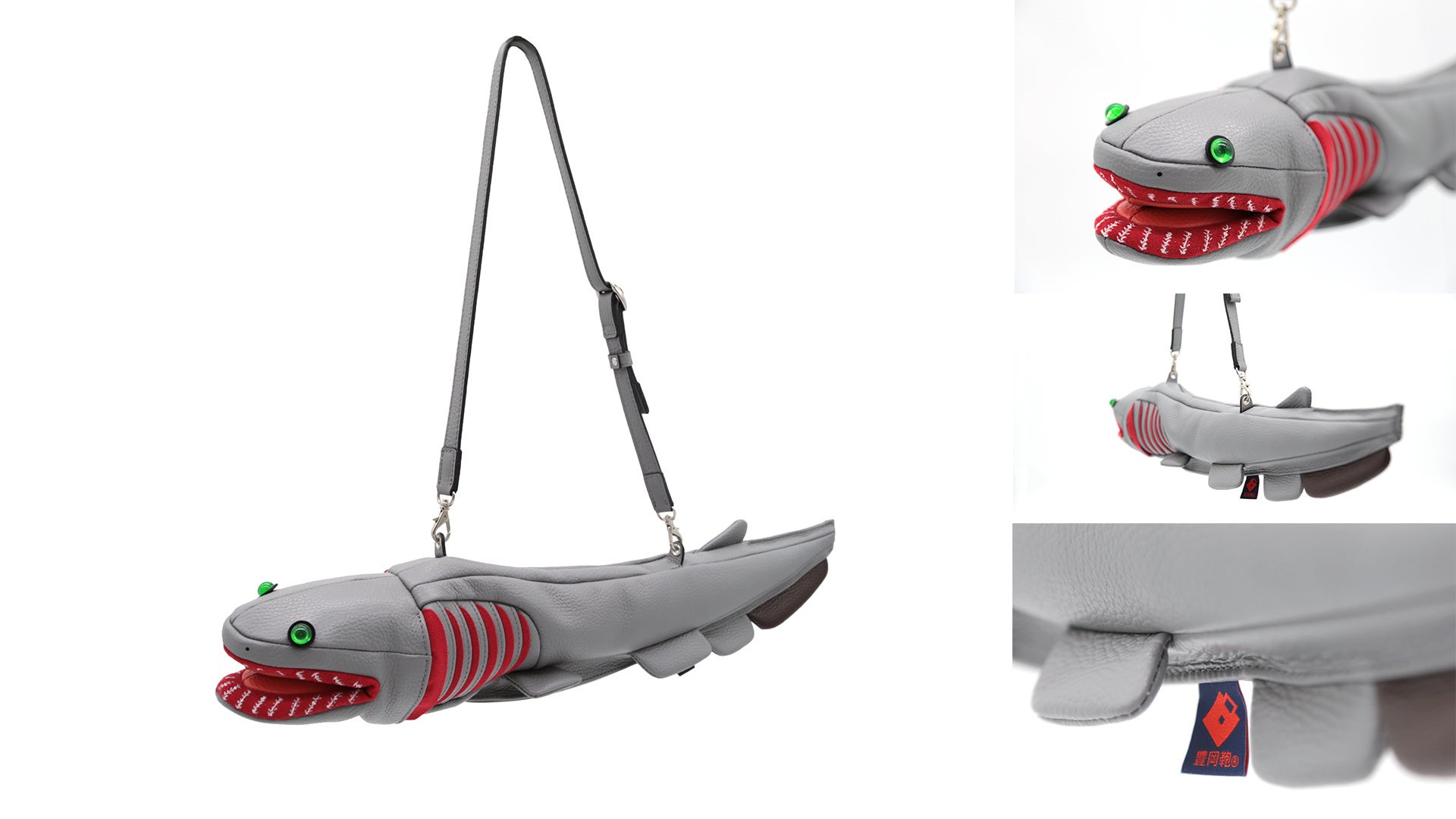 ラブカの鰓や口、ヒレなど、100を超えるパーツを縫い合わせて鞄を作りました。ビー玉のような綺麗な目にしたいというきょうすけさんの要望をもとに、緑に染めたレジンを固めて、オリジナルで作っています。「口からものを出し入れする」という作者のこだわりもしっかりと形にするため、お腹や背中にはファスナーをつけていないのもポイントです。