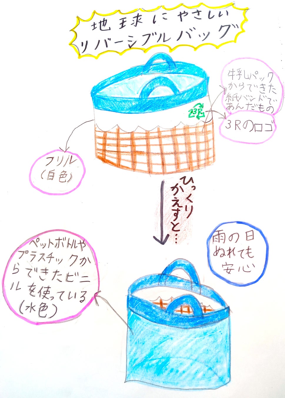紙バンドは水に弱いので、雨が降った時にひっくり返すと、ペットボトルやプラスチックからリサイクルされたビニルのバッグになります。私はこのカバンを作って夏にたくさん遊びに行きたいです!