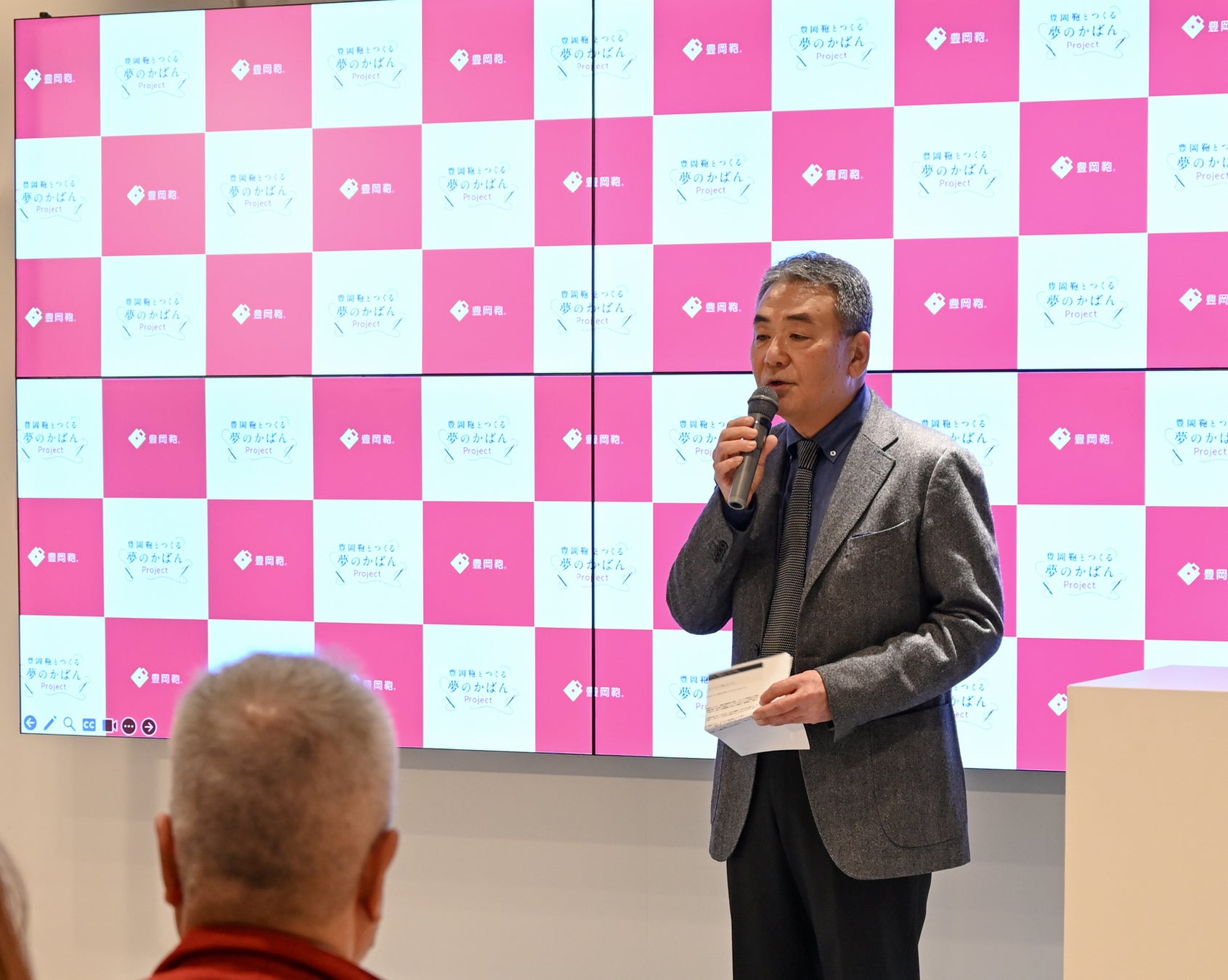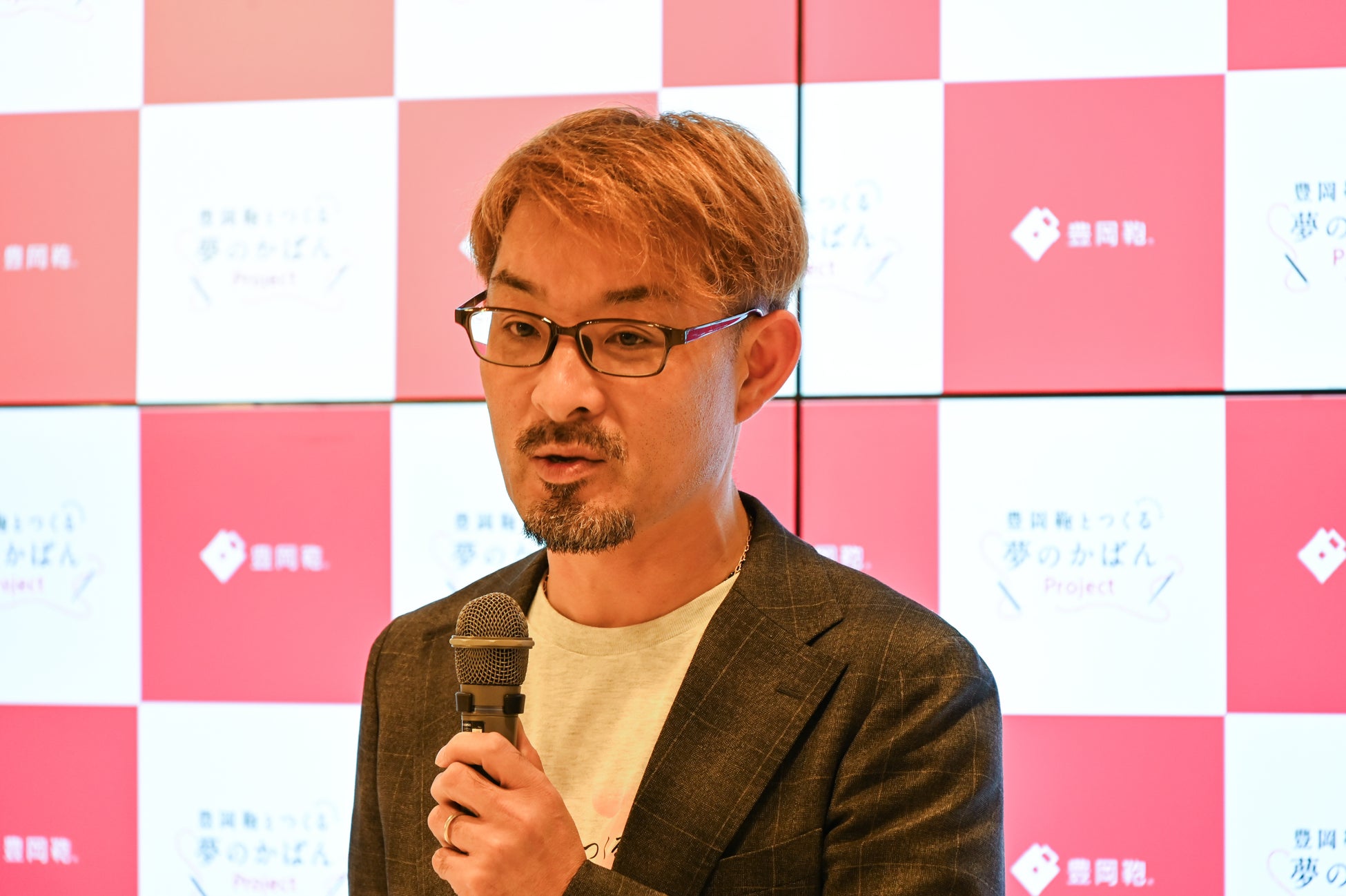 「豊岡は、日本一のかばんの産地、そして豊岡鞄は皆様の大事なものを運ぶ、品質の良いカバンを世に出しております。そして我々が大事にしているのは、「どこまでも、かばんであること。」という価値観です。皆様の大事なものを運ぶかばんだからこそ、素材品質にこだわり、地域で切磋琢磨して技術を磨いてきました。しかし、近年の少子高齢化、後継者問題による人材不足ということが全国のかばん業界でも大きな課題になっております。我々は豊岡鞄を全国区にすることにより、今後も続く産業を目指して行きたいと思っております。今回、夢のかばんプロジェクトは未来あるお子様にも、ものづくりの魅力を知っていただきたいという思いでスタートいたしました。SNSやWEBでの応募、そしてワークショップを通じて全国から173の絵を届けていただき、一つ一つ、審査をし、選ばれたお子様を豊岡の工場見学にお招きさせていただきました。そして、みなさんが描いた絵を形にするために、我々職人たちと打ち合わせしながら、ものづくりのプロセスを体験していただけたと思っております。