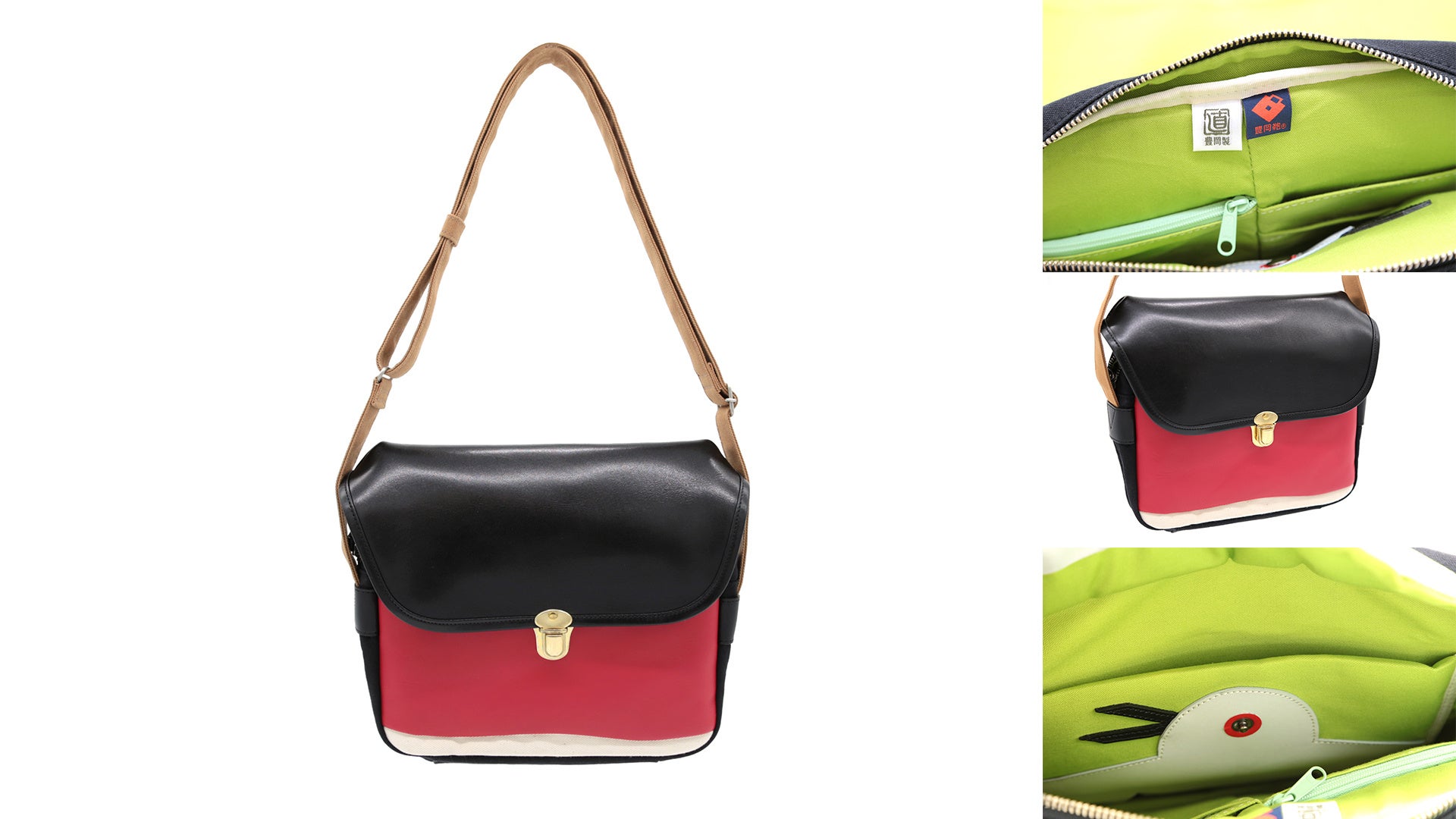 こだわり:豊岡鞄は豊岡の名物なので、そこの有名な名物であるコウノトリを元にして鞄のデザインを考えました。コウノトリは白色に黒色の羽が混ざっていて、目の当たりには赤色が入っているので、鞄の蓋は黒、下側は白、白の部分にピンク寄りの赤色の模様を入れました。肩掛けの紐の部分は土の明るい茶色、中身は木や草など自然の象徴の緑にしました。二つポケットを作り、一つは実用的でファスナーなどがついているもの、もう一つはコウノトリポッケとを作りました。デザインには詳しく書いていないが、コウノトリポケットは目に当たるボタンを黒色に、胴体は白と黒を混ぜ(左側が白で、右斜め下の部分は黒色)、嘴は黒くしました。この肩掛けコウノトリ鞄は実用的さ、そして豊岡の名物、どちらも重視し、使って感じることができる鞄になっています。