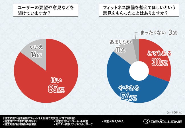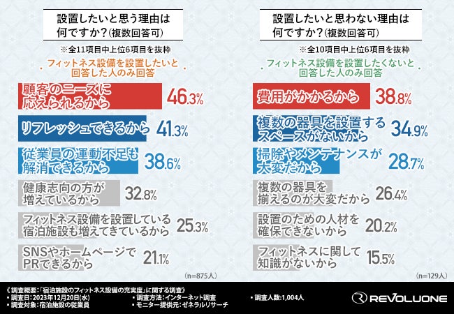 また、宿泊施設で働く従業員の約9割が勤務する宿泊施設にフィットネス設備を設置したいと回答しており、従業員からの需要も高いことが明らかになっています。