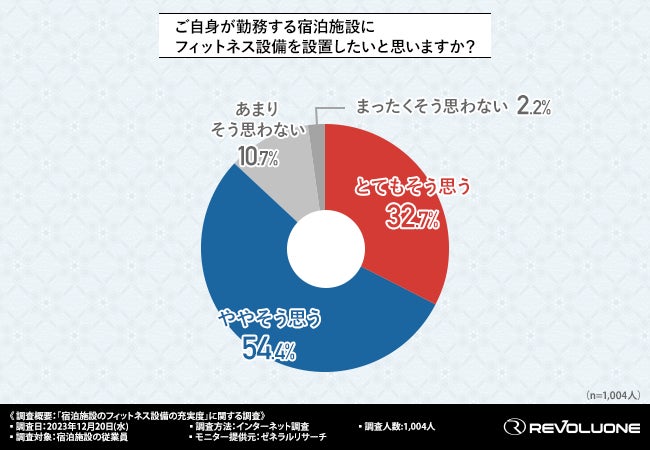 続いて、「ご自身が勤務する宿泊施設にフィットネス設備を設置したいと思いますか?」と質問したところ、『とてもそう思う(32.7%)』『ややそう思う(54.4%)』『あまりそう思わない(10.7%)』『まったくそう思わない(2.2%)』という回答結果になりました。