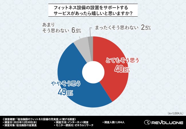 最後に、「フィットネス設備の設置をサポートするサービスがあったら嬉しいと思いますか?」と質問したところ、『とてもそう思う(40.8%)』『ややそう思う(49.8%)』『あまりそう思わない(6.9%)』『まったくそう思わない(2.5%)』という回答結果になりました。