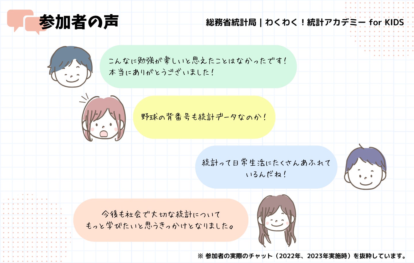 ・申込みを通じてご提供いただいた個人情報は、「わくわく!統計アカデミー for KIDS 2024 」に必要な範囲内でのみ利用し、イベントサイトに記載の「プライバシーポリシー」の規定に従い適正に取り扱います。