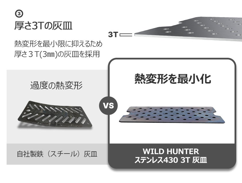 3次燃焼で無駄なく薪を燃焼させ、燃焼効率がとても高いため、ほとんど燃えカスが残りません。また、通常1次燃焼の後、酸素不足により燃え残った未燃焼ガスが煙となりますが、WILD HUNTERは燃え残った未燃焼ガスを3次燃焼まで再燃焼させることで煙の発生を抑えることができます。