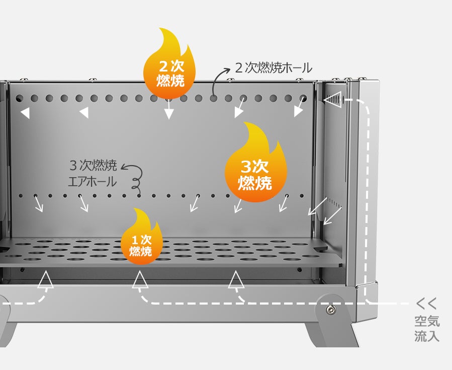 1次燃焼で燃焼しきれなかった可燃成分が2次燃焼ホールから排出され、2次燃焼を起こします。更に残った未燃焼の成分が3次燃焼エアホールから排出され「3次燃焼」を起こす事ができます。