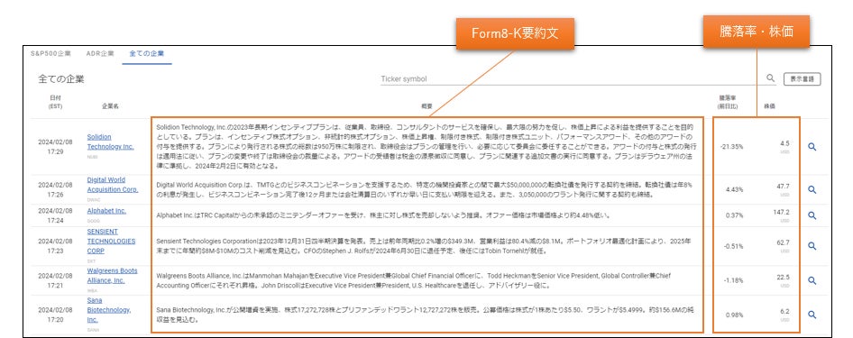 登録している企業が直近24時間以内に適時開示を行なった全ての情報を、ChatGPTを活用して要約・翻訳を行なったうえでユーザーに提供します。※米国SECが定める「Form8-K」の形式での開示を指します。
