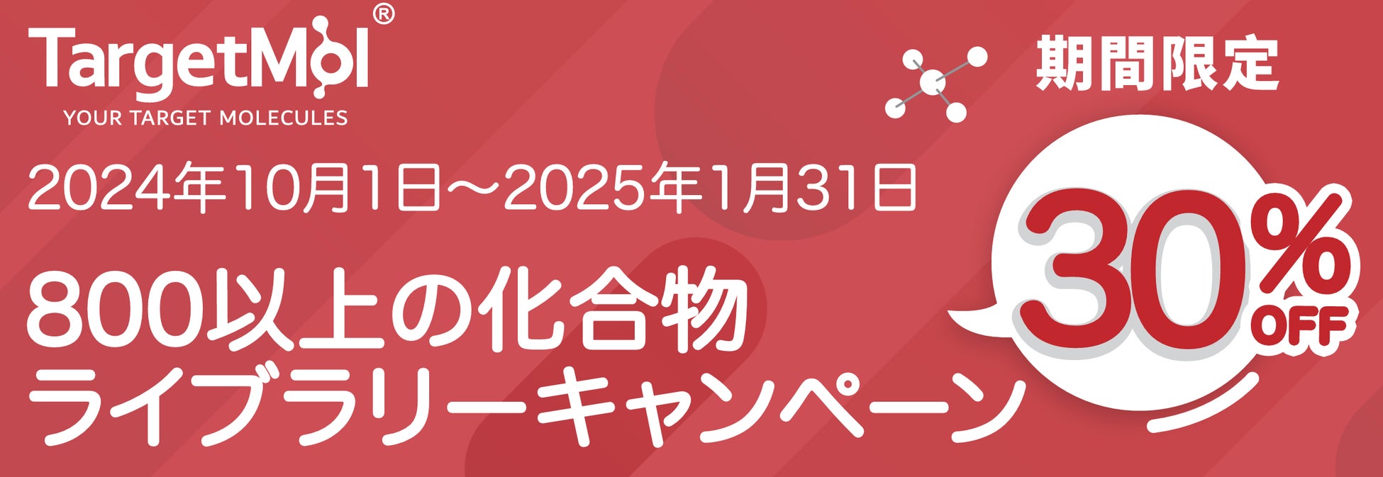 研究用試薬メーカーのTargetMolは、800種類以上の化合物ライブラリーを定価の30%割引で提供いたします。期間:2024年10月1日~2025年1月31日