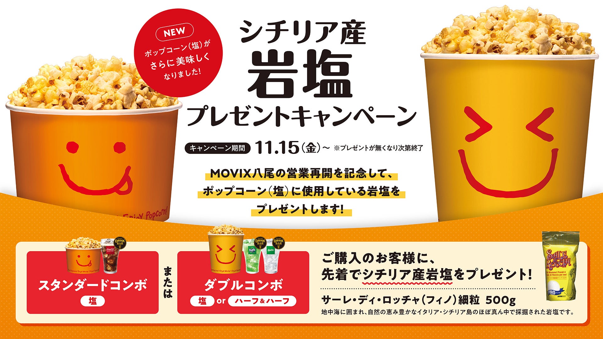 11月15日(金)より、スタンダードコンボ塩味またはダブルコンボをご購入のお客様に先着でポップコーンに使用しているシチリア産岩塩「サーレ・ディ・ロッチャ(フィノ)」500gをプレゼント!