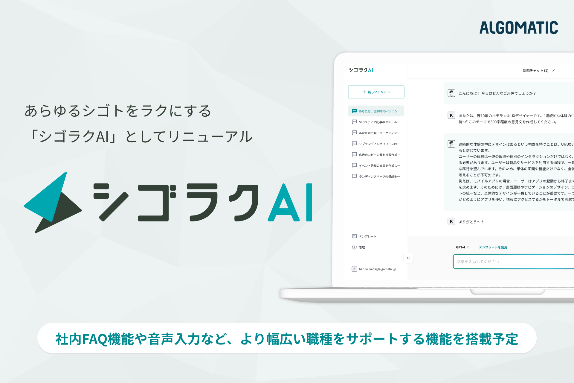 2022年11月にChatGPTが登場した当初、エンジニアやマーケターといった職種の方を中心に「ビジネスで活用したい」という要望を多くいただき、Algomaticは2023年5月から「ビジネスGAI」という名称でサービスを開始しました。しかし、ChatGPTの普及に伴い、保育業界や介護業界、行政や教育機関といった広範な領域でChatGPTを活用できることがわかってきました。こうした状況を受け、Algomaticは一部の職種の課題を解決することだけを想定したサービスでなく、あらゆる人の「シゴト」を「ラクにする」サービスとして「ビジネスGAI」を進化させていくべきだと判断し、このたび「シゴラクAI」へのリニューアルを行います。