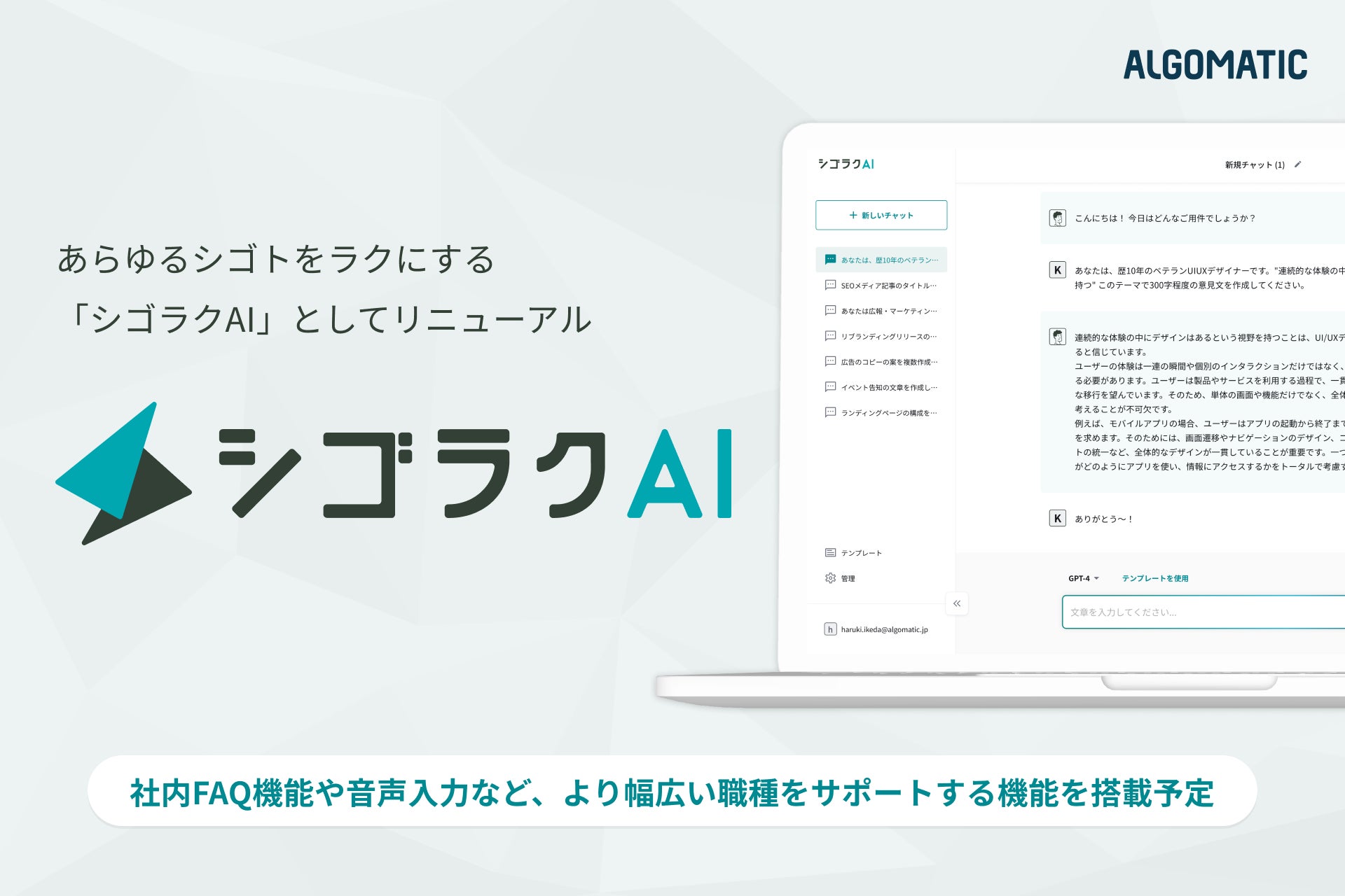 Algomaticが提供する法人向け生成AI活用プラットフォームが、あらゆるシゴトをラクにする「シゴラクAI」としてリニューアル