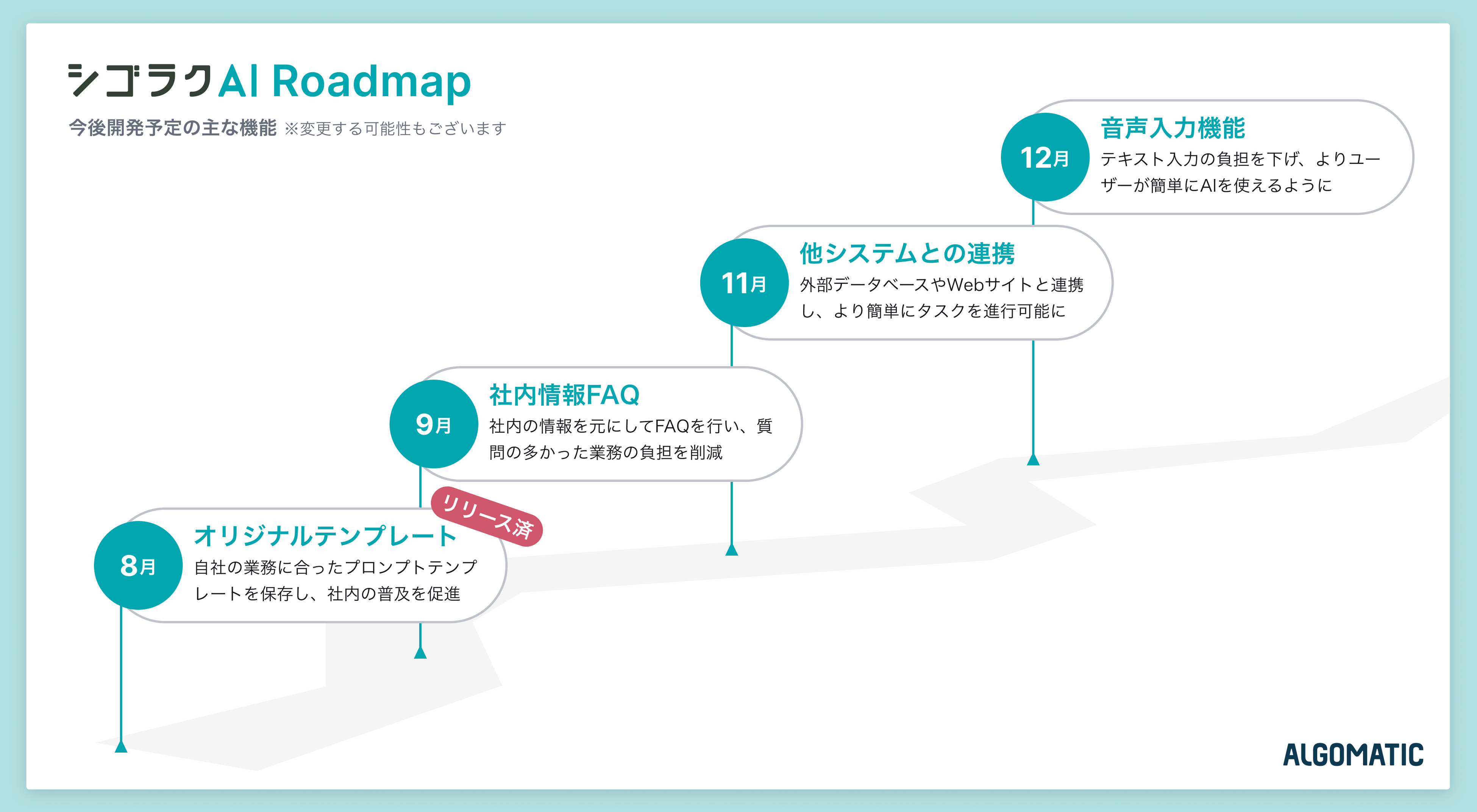 シゴラクAIは誰でも使いやすく、成果が出せるサービスを目指し、次のように生まれ変わっていきます。