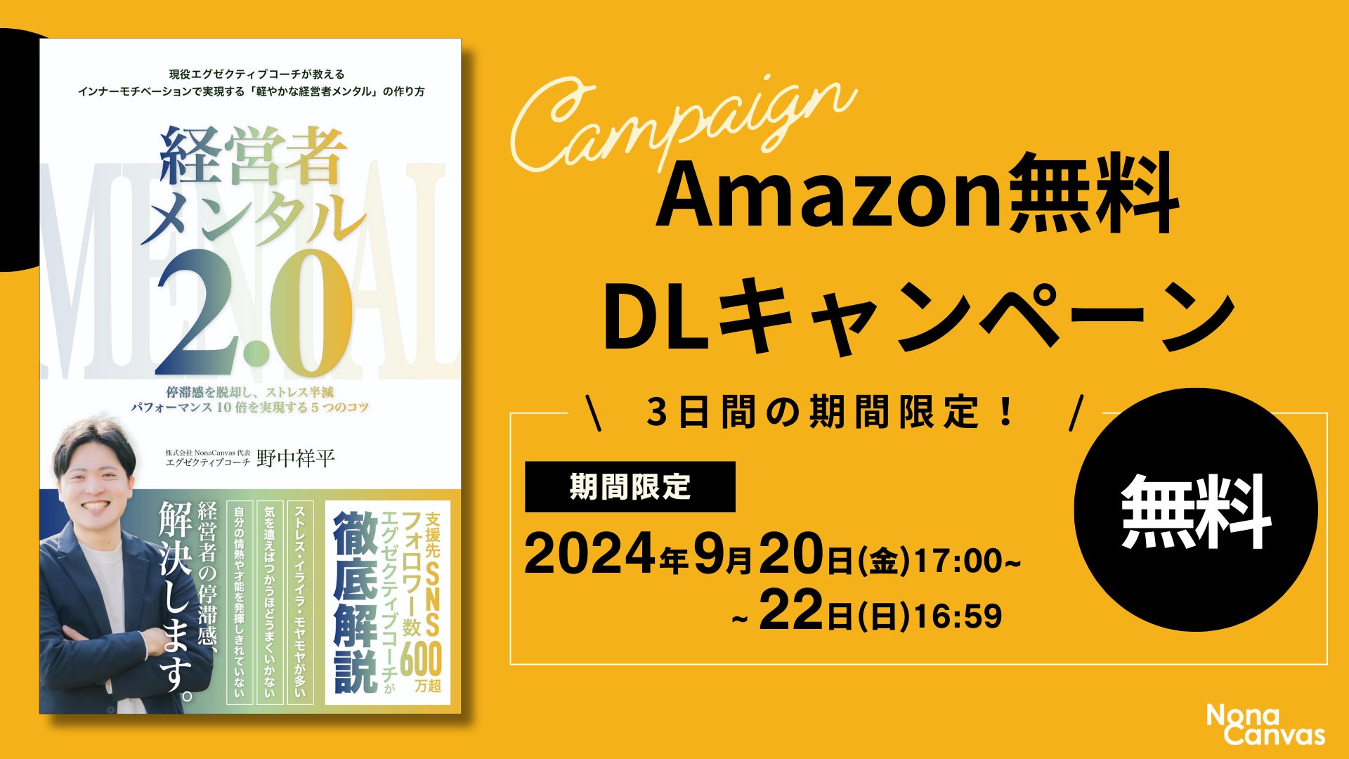エグゼクティブコーチング事業を展開する株式会社NonaCanvas(本社:東京都千代田区、代表取締役:野中祥平)は、2024年9月20日に新刊『経営者メンタル2.0:現役エグゼクティブコーチが教える、インナーモチベーションで実現する「軽やかな経営者メンタル」の作り方(著者:野中祥平)』を出版いたしました。これを記念し、Amazon.co.jpにて、3日間限定の「Amazon無料ダウンロードキャンペーン」を実施いたします。