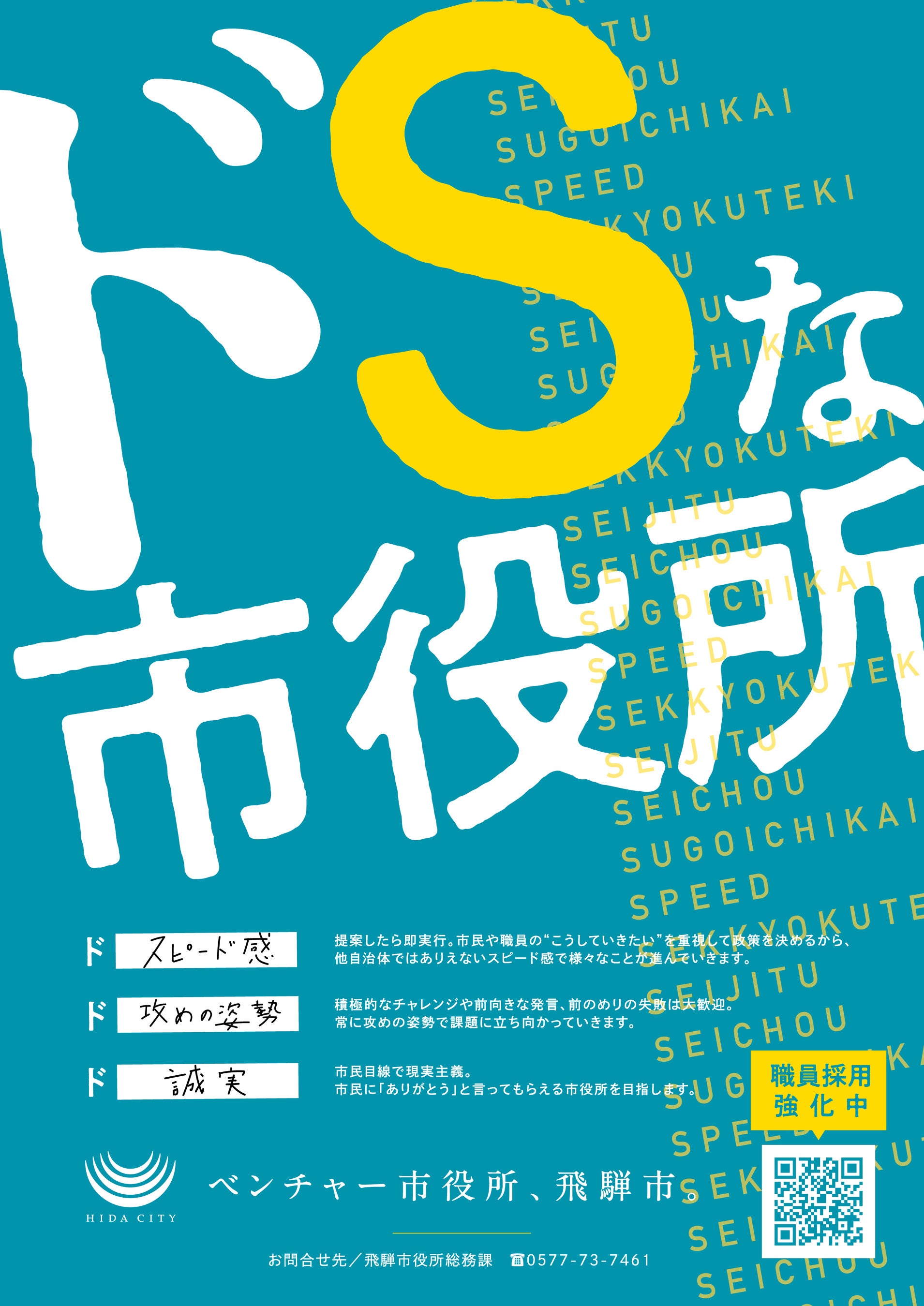 私たち飛騨市役所職員が、仕事に取り組む姿勢や心得を3つのSで表しています。