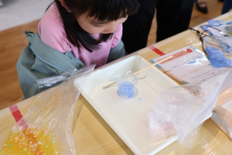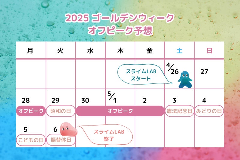 期間中、平日の4月28日(月)、30日(水)、5月1日(木)、2日(金)はオフピークと予想されます。なるべく混雑を避けて、親子でスライムづくりを体験されたい方におすすめです。また、混雑解消のために、時間ごとに入場の定員を設けます。
