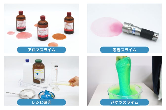 暗闇で光るスライムや、ふわふわスライム、紫外線で色が変わるスライムなど、試薬を混ぜていろいろなスライムがつくれます。さらに、スライムのレシピ研究や薬品を混ぜる合成研究など、遊び気分で科学を体験できます。