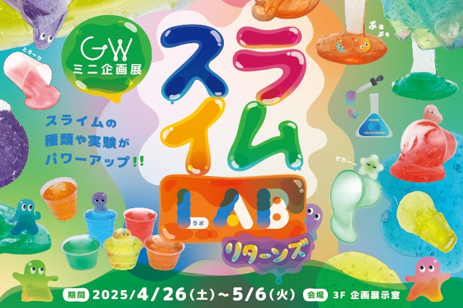 2025年4月26日(土)~5月6日(火・祝)に、イマジナス3F 企画展示室でゴールデンウィーク限定のコンテンツに入れ替え、GWミニ企画展「スライムLABリターンズ」を開催いたします。