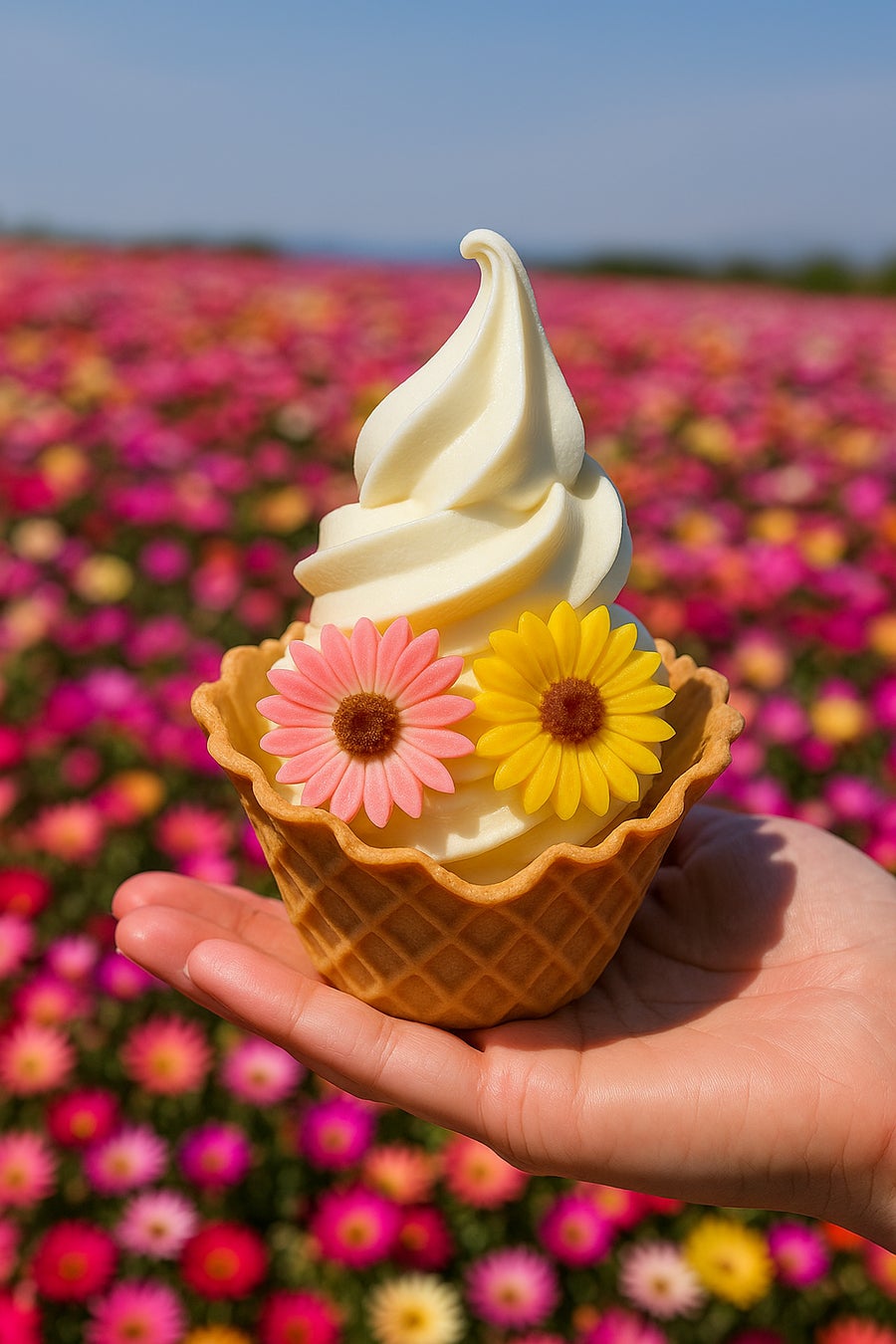 開花に合わせ期間限定デージーソフト。オープンカフェが人気「ローズカフェ」でお求めいただけます。