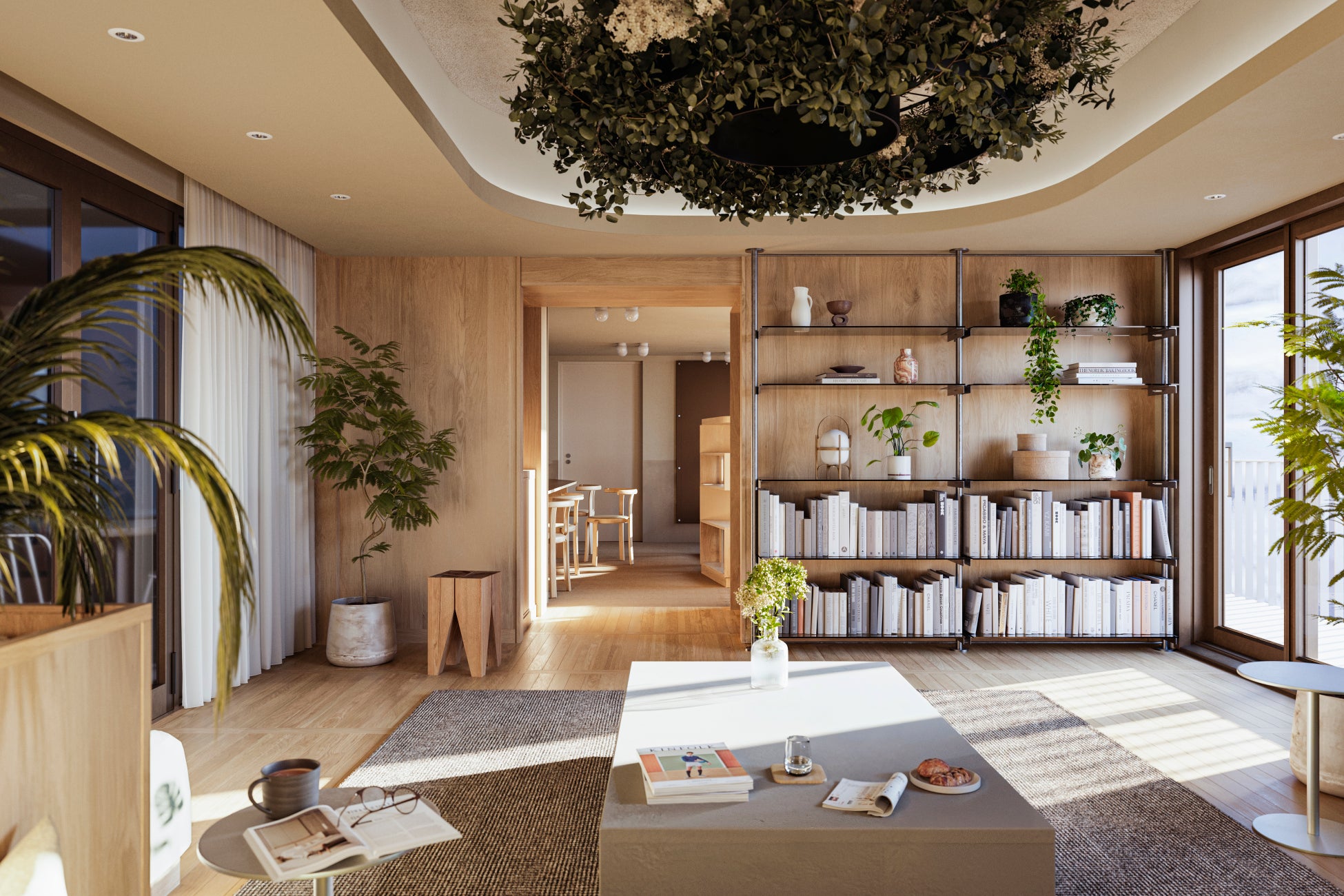 キッチンの隣に位置するダイニングルームには、大テーブル、カウンターテーブル、カフェテーブルを用意し、その時の気分にあった心地よい場所で食事や会話をお楽しみいただけます。