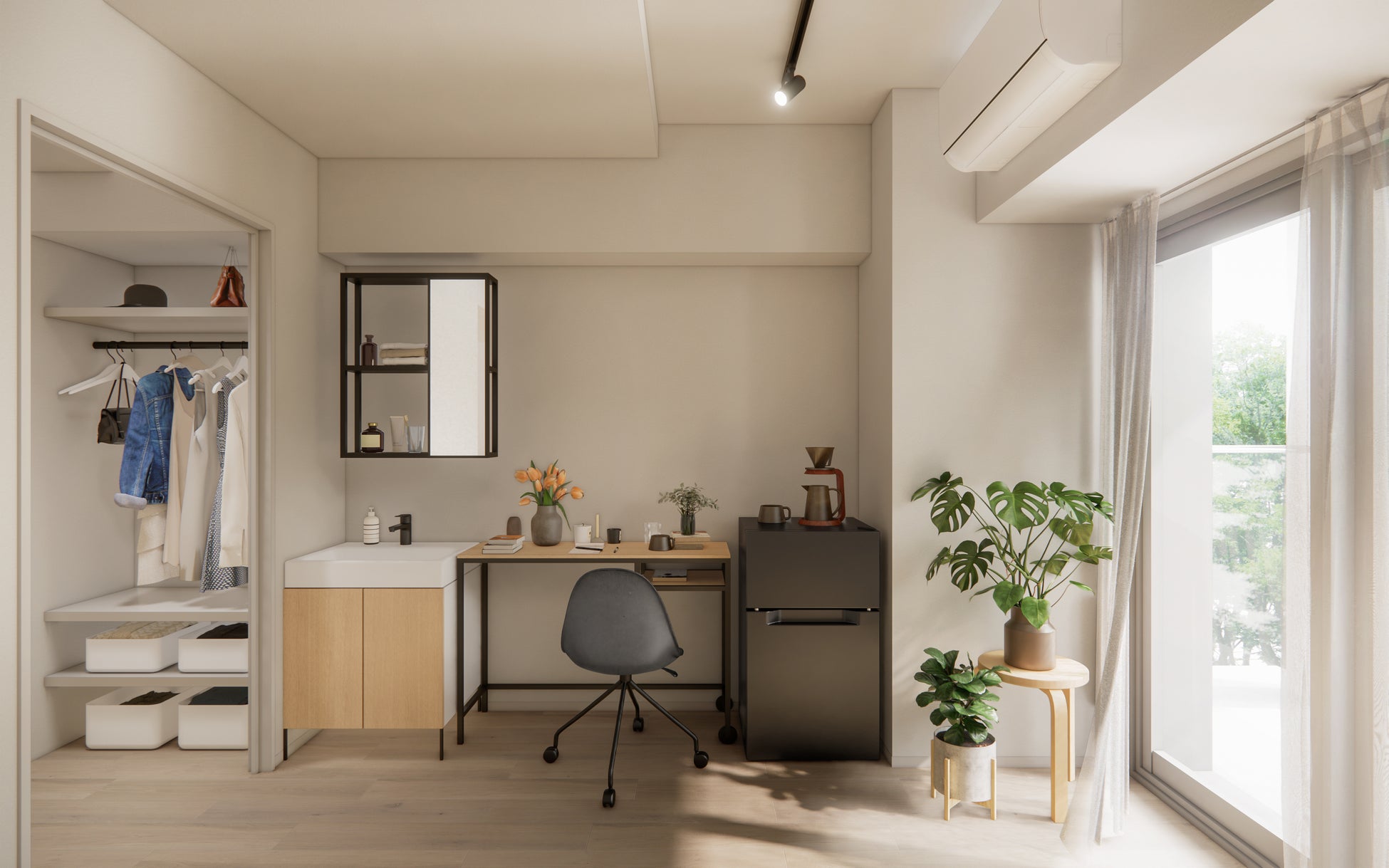 自分だけの「暮らし心地」を表現できる個室空間は、自由に配置を変えられる家具付き。シャワーや洗面台など、身支度を整える設備も揃っています。バスタブ付きのお部屋もあり、ほっと安らぐ自分だけの空間を楽しんでいただけるように工夫しました。