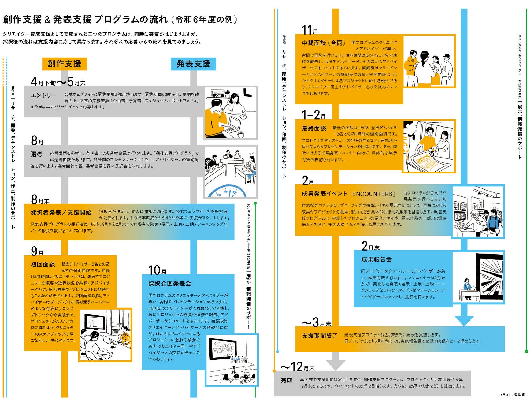 創作支援プログラムと発表支援プログラムは同時に募集が始まり、採択後は各々のプログラムで支援を行います。専門家からのアドバイスや他のクリエイターとの交流機会の提供、広報協力などを実施します。