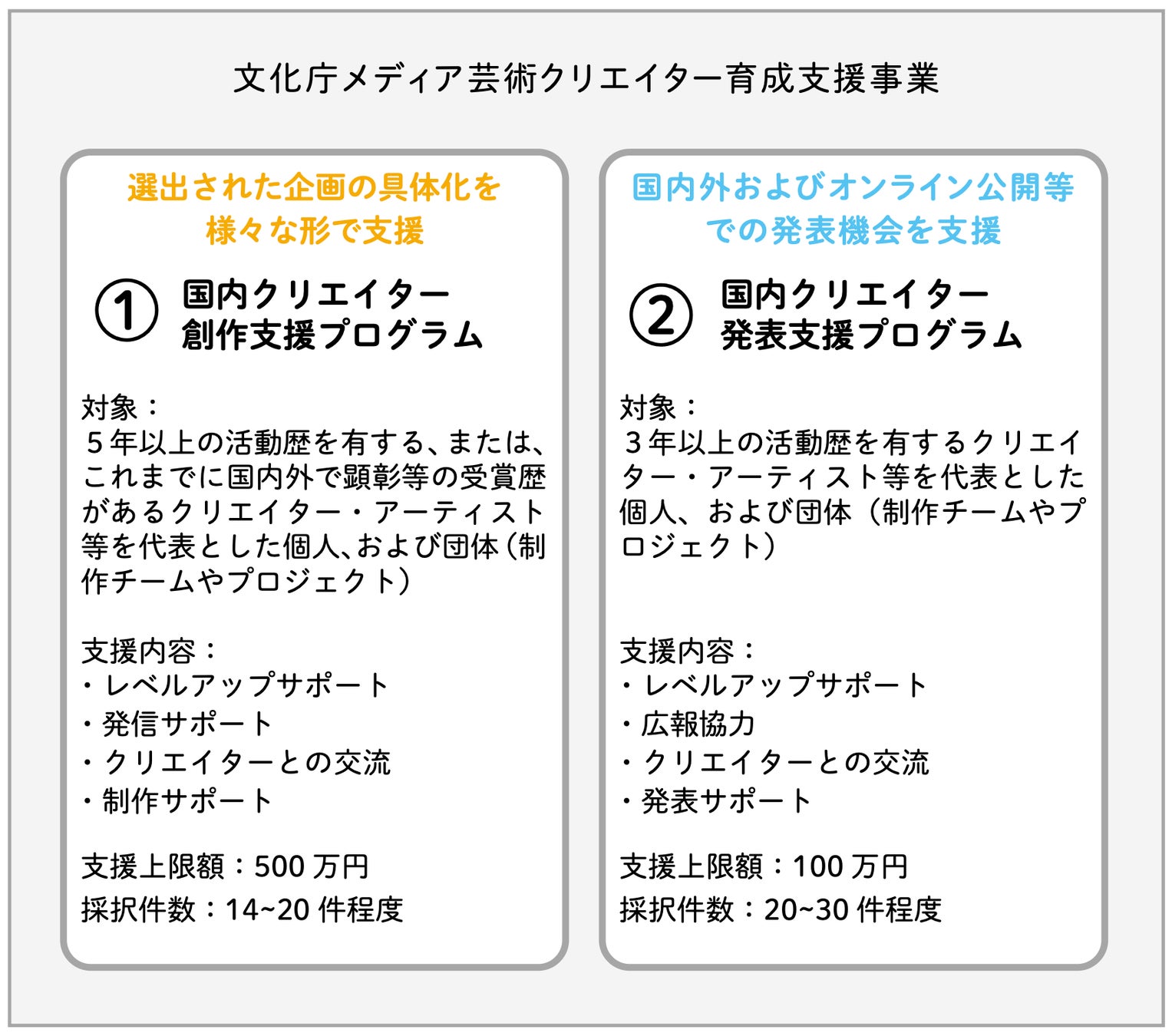 「国内クリエイター創作支援プログラム」は、5年以上の活動歴を有する、または、これまでに国内外で顕彰等の受賞歴がある概ね40代までのクリエイターが対象。「国内クリエイター発表支援プログラム」では3年以上の活動歴を有する概ね40代までのクリエイターを対象にしています。