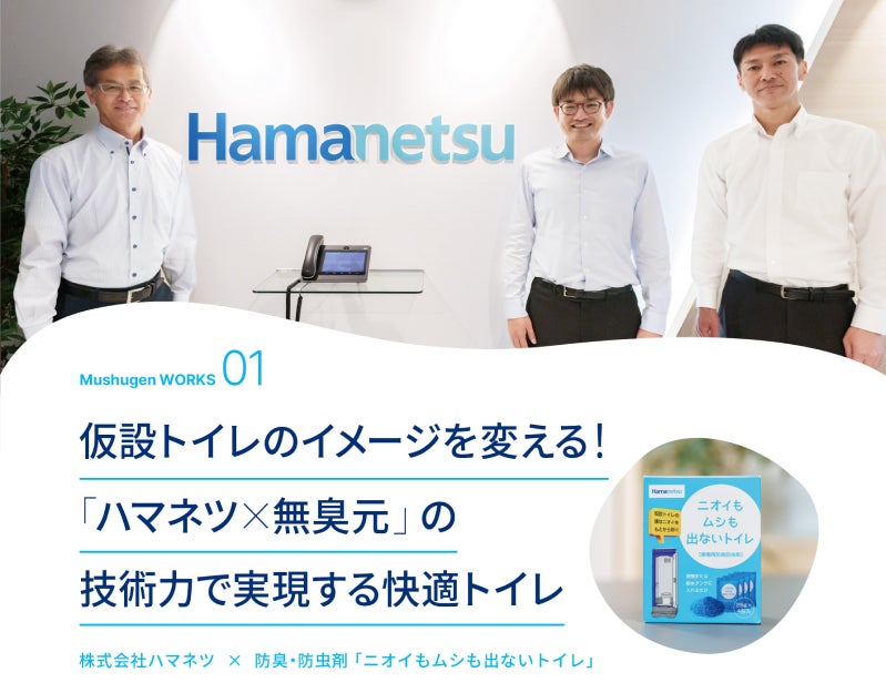 無臭元工業株式会社(所在地:東京都足立区、代表取締役:田崎 雄大、以下 当社)は、仮設トイレをはじめとする屋外ユニットの開発・製造・販売を手掛ける株式会社ハマネツ(本社:静岡県浜松市、代表取締役社長:河藤一博、以下 ハマネツ社)との共同により製品化を行った防臭・防虫剤「ニオイもムシも出ないトイレ」に関する製品開発エピソードの事例インタビューを公開いたしました。